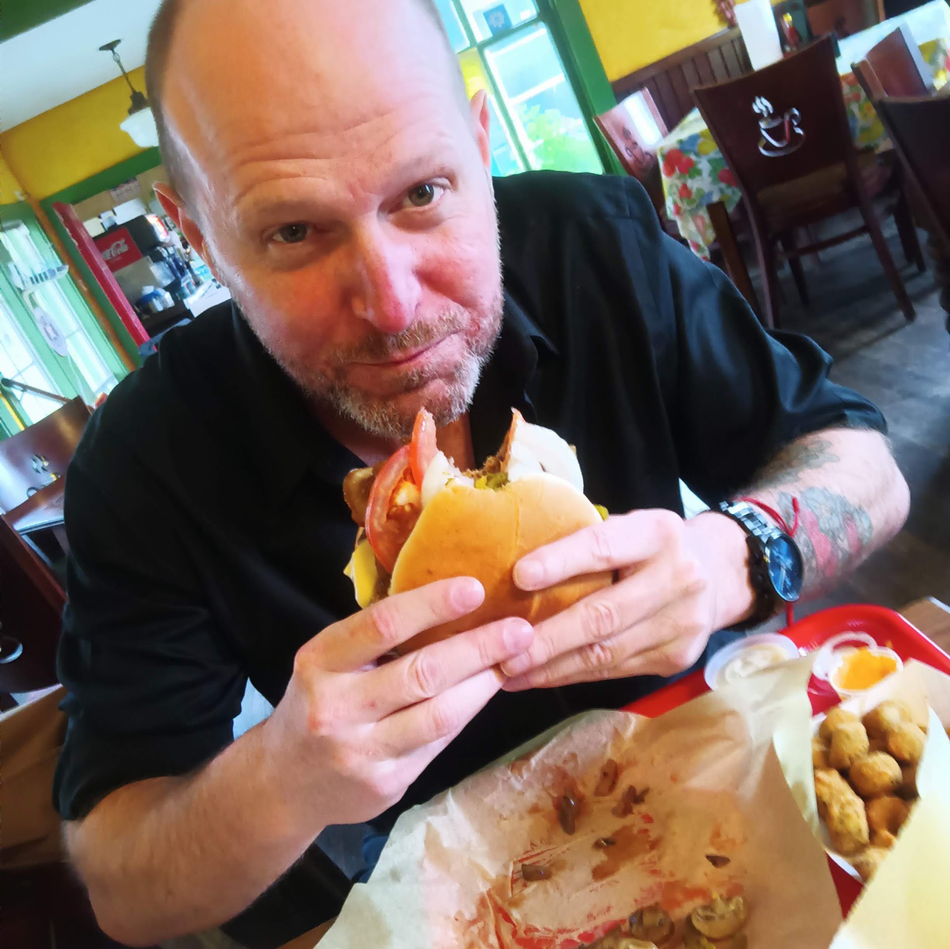I'll be honest, y'all. The burger was just pretty good, but lunch today was one of the greatest meals I've had in a long while. Meals aren't always about the food. (Seriously, nobody tell him...