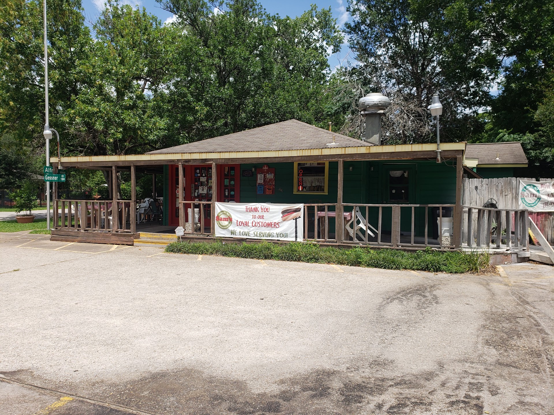 The location itself is very easy to spot, and anyone often driving down gessner from 290 to clay would know it as the joint with the big burger outside. Put along with its different types of seats, featuring in - building dining room, porch with the plastic seats, or tree-side picnic benches, there is a certain familiarity that one gets in dining here.