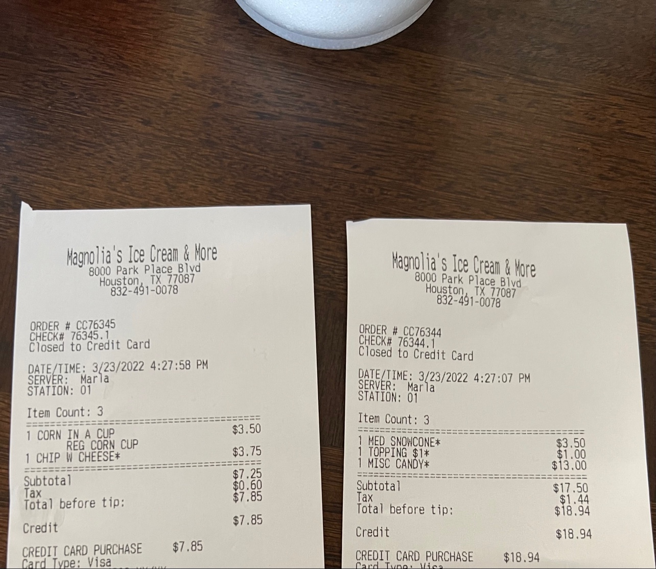 Person who took our order was really nice but the person who rang us up for our order dint know what she was doing. We ordered a snowcone with extra pickles and she was trying to ring us up for a picollada, which are almost similar but not the same. Then when my girlfriend tried to correct her she only rang us up for the snowcone and the candy. And when we asked for the rest of our order (corn in a cup and the chips), she started talking in Spanish telling her coworker that we told her that all we had ordered was the snowcone and the candy. I know it’s not a crime to speak Spanish but I felt like she did that because she thought we dint know Spanish? Obviamente ablamos español I si mi novia se mira morenita no significa que no...