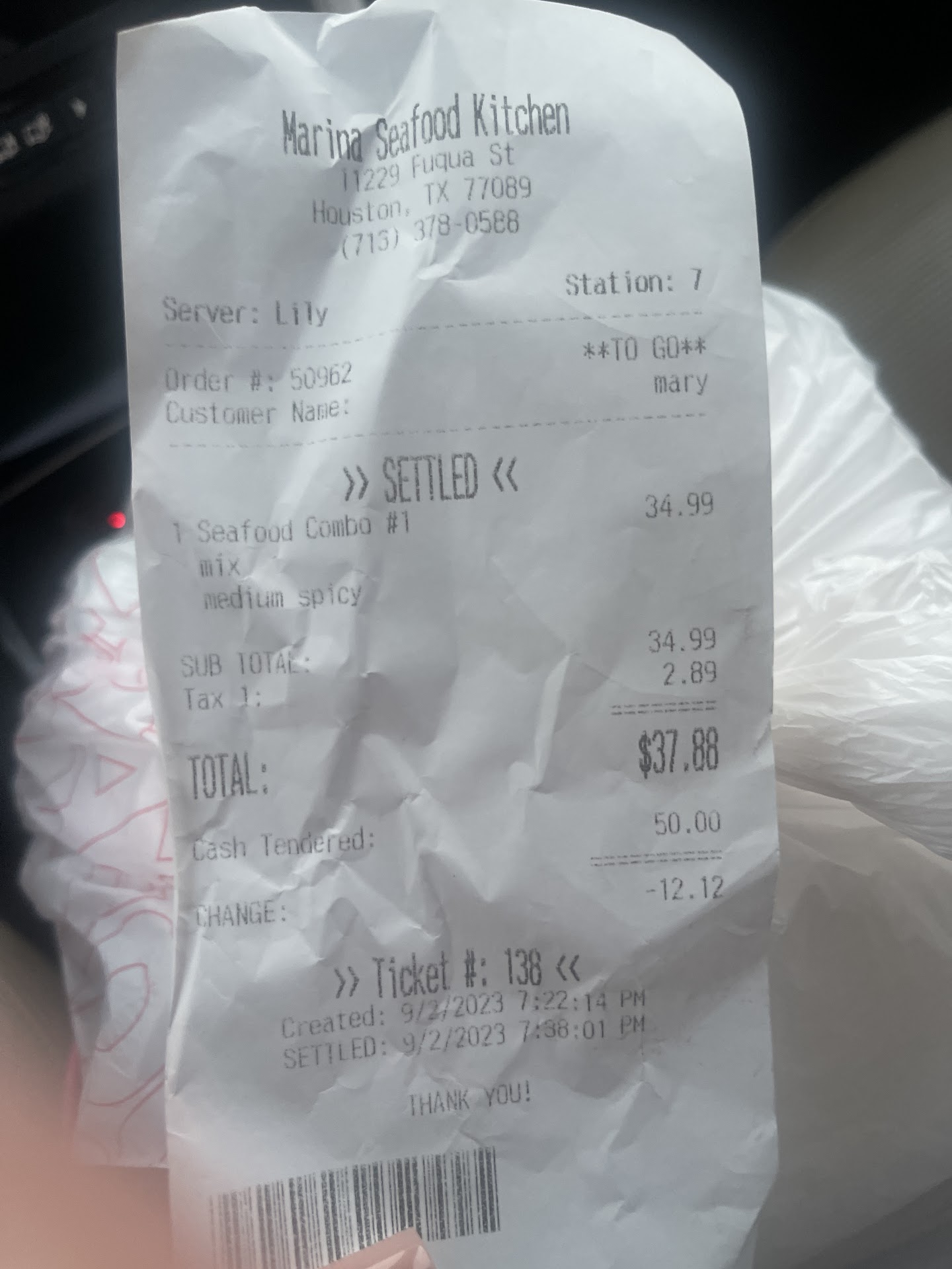 This establishment has been some of the best seafood fare I have eaten in Texas. The fried fish and shrimp are exceptional. Expertly fried and not greasy at all. Their homemade tartar and cocktail sauces are excellent and should be jarred and sold at grocery stores. Their boiled crawfish was flavorful. I had the cajun and garlic spice mix as recommended by Lilly. The crawfish étouffée was spot on. It was served with a generous helping of their steamed rice and a large portion of etouffee. They offer gumbo in two portions. The portions are a cup or bowl. I ordered a cup. They proceeded to provide me with a portion that could have been a meal on its own. This is refreshing as most establishments when ordering a cup size will place an espresso cup in front of you filled with their fare. I don’t even know what the size of the bowl portion would be. The gumbo tasted great and had the flavor of a roux that had been painstakingly prepared and not from a pouch or a can. My son decided he wanted an order of General Tso’s Chicken. It was served with a generous portion of their fried rice and some of the most flavorful chicken I have eaten in this variety with slices of jalapeño intermingled. It was a flavorful and original take on General Tso’s Chicken. Now, for their star dish. It is the shrimp fried rice. My coworkers and I have been ordering from Marinas on Fridays during Lent and the shrimp fried rice is everyone’s favorite. As a matter of fact we leave out the french fries and ask for extra rice no matter the extra cost. It is awesome with whole shrimp in the rice it is a perfect complement to their generously portioned family combos. Try this place. You will not be...