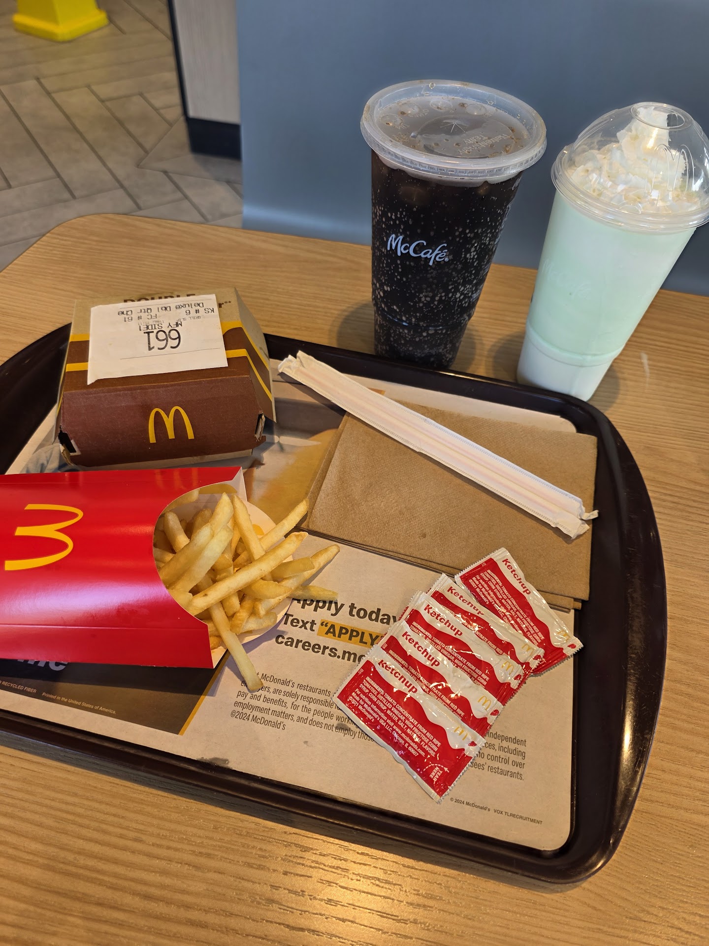 Read moreFirst time visiting this location but it was horrendous. I visited on May 20th at 12:15am and ordered a quarter pounder with a few specifications only being told that their slushee machine was down and ice cream as well. So I order the quarter pounder meal and pull up to pay for my order. The guy that was taking payment literally did not speak a single word to me except to demand the payment, so I pay and go to the second window to receive my phone and itâs literally a manager and a crew member just standing there. At this point, no one has said anything to me about my order, so I pull up my window and 5 mins later, I receive my phone. So I pull to the side to eat. Two bites into the sandwich, I find out the meat is completely raw, I am just livid at this point and I call the store to speak to a manager and no one picks up, so I have to pull BACK around and wait in line again to get a replacement burger. I get the 2nd window and at this point, I have not seen a a manger or talked to one. The cook from the back brings me another bag, so I pull off. Parked on the side, I decide to take a look at my neat before eating this time only to find out itâs RAW again. So, thereâs no point they literally do not know how to cook meat so I go home just digusted and threw the whole meal away. What a waste...