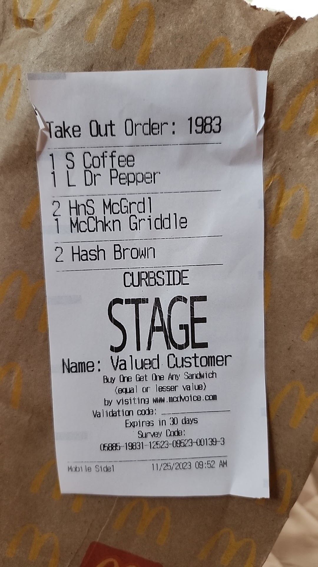 The app crashed when it was time to pick up my curbside order, so i couldnt choose a curbside spot OR see my 4 digit code. Tried to wait for a bit to see if someone would come out anyway since the order was placed at 9:52am but no one did and the drive thru line was long. Ended up waiting thru the line (couldnt go inside bc no shoes on since i was expecting to curbside). They ended up telling me there was no curbside order under my name several times and said i couldnt get a refund even w email receipt OR replacement meal bc it wasnt on their system even tho the app screenshot and email said i had my order at that location. Said i had to go thru the app for a refund & when i said i couldnt find an option for that Employee said "i dont know how to use the app, just figure it out" & closed the window on me. So i sat there in my car saying i wouldnt move until they give me a refund or make my food bc i have a receipt. They ended up finding my order sitting there and gave me cold food, a flat soda and cold "hot" coffee and then told me its my fault for calling it a mobile order instead of a curbside order which i never did. Worst experience & by the way, they dont have a phone so dont bother calling them like i tried. By the time i got my cold food it had been an hour already. Ive heard their managers a...