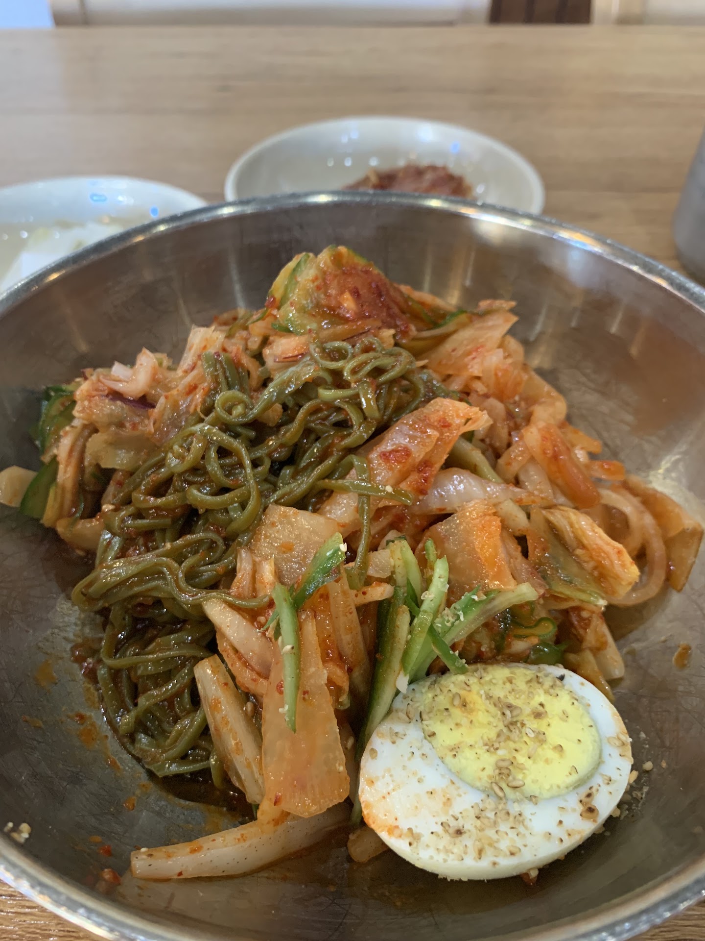 I got their pan fried pork dumplings and bibimguksu (#10 on menu), which is hand pulled chlorella noodles (an algae with a bunch of nutritional benefits) with spicy sauce, veggie assortments, and a half hard boiled egg. The noodles also come with two types of kimchi as your complimentary side [ I personally prefer the white kimchi over red b/c the red kimchi reminded me of Ba Khia crab not my favorite :( ]. Here's my verdict: