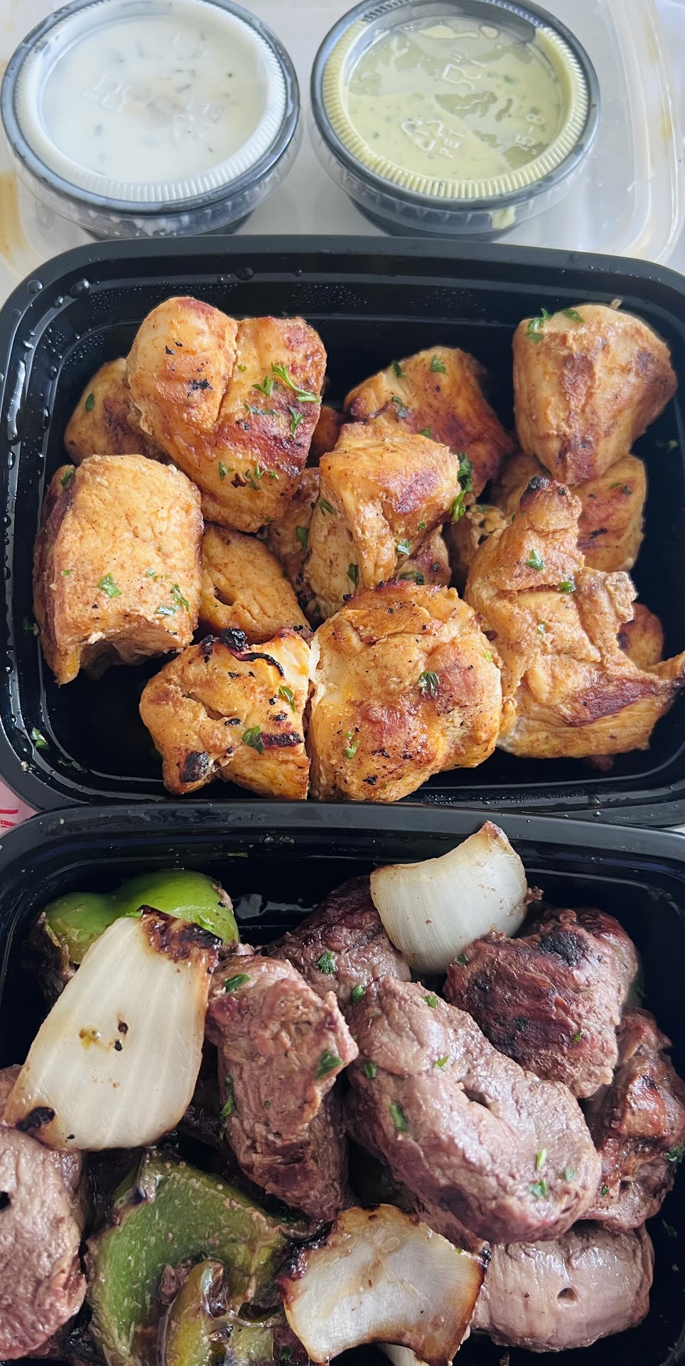 Read moreMean Grille is AWESOME! This was my first time and I will be back soon and often. If you like to meal prep with delicious, clean protein and locally sourced veggies, but are feeling too lazy to cook, this will become your go-to. I knew I’d love this place!❤️🔥 I ordered chicken and beef tenderloin kabobs ala carte. The pic shows 2 orders of each. The meat and chicken are seasoned and cooked to perfection! And OMG, the dipping sauces! Chef’s kiss.🤌🏻🤌🏻 I got the garlic yogurt and spicy cilantro. You need both. Trust me on this. Get extra! They're insanely good and complement each other perfectly. The kabobs would be amazing in a salad or as a low carb wrap but it’s most delicious on its own, with a double drizzle of those delectable house-made sauces.