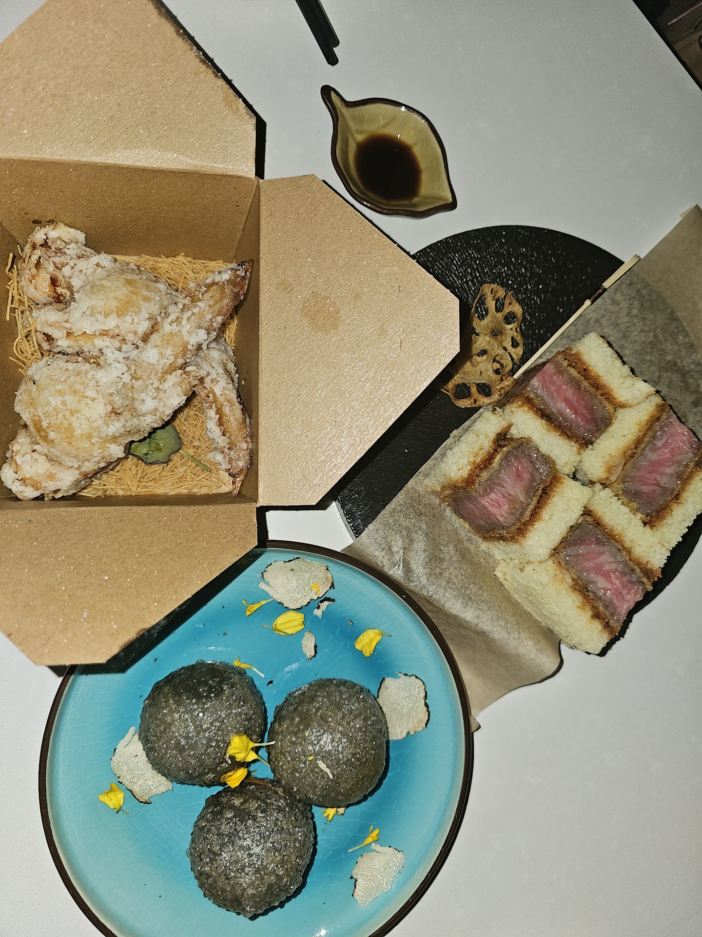 Chicken wing mochi karaage: this was so good, presentation could be better, it comes in a brown togo box, a nice round hybrid bowl plate could work better