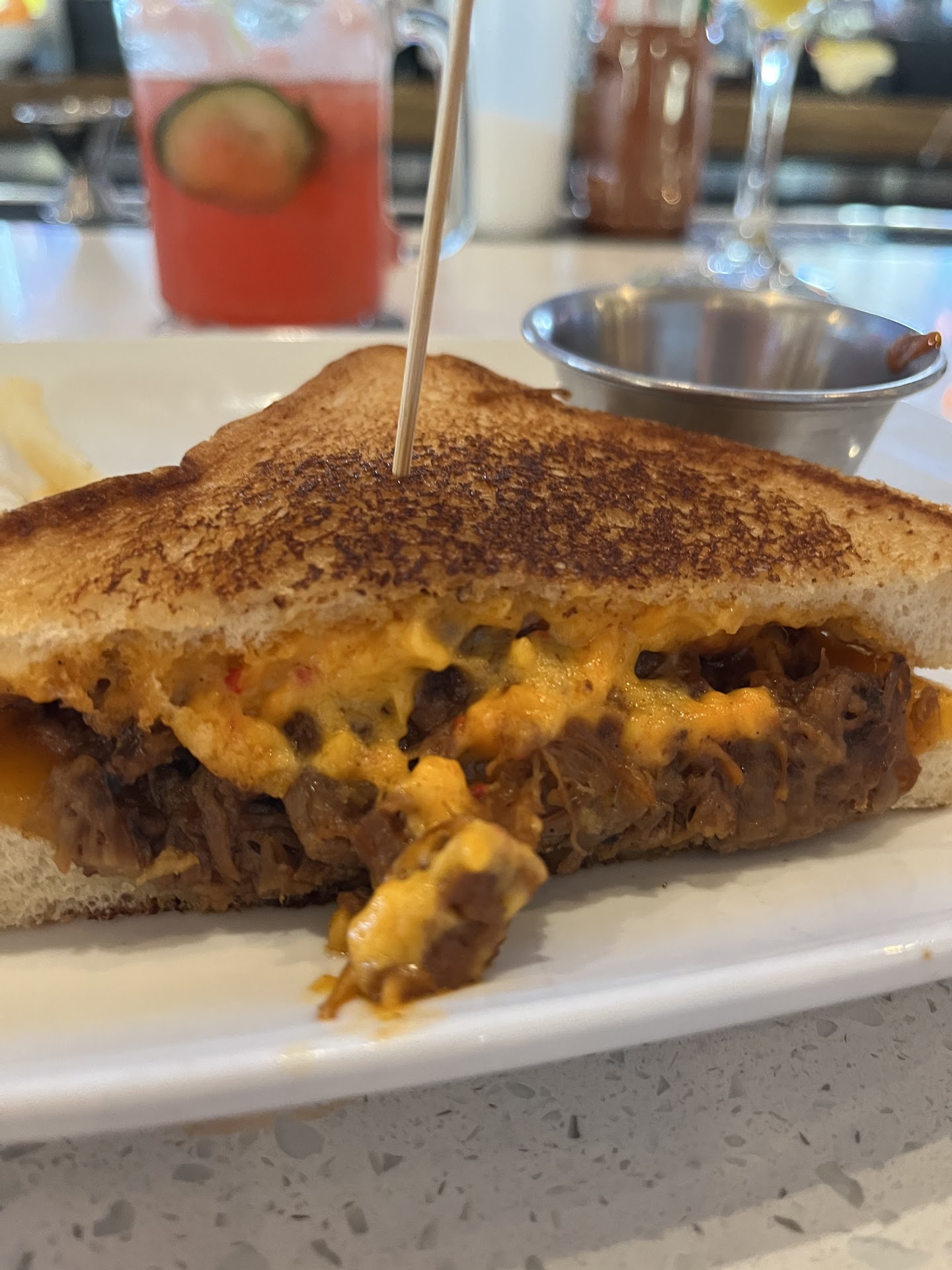 We ordered the “infamous brisket grilled cheese.” What an appropriate name considering how awful it was. First, it took over 20 mins for it to come out to us, this seemed high considering it wasn’t busy. Once the bartender overheard us talking about how long it was taking he ran to the back( you could tell he had forgotten all about it.) when he came back out he was holding the plate with a towel and told us to be careful because the plate was hot. I work in the industry so I know when food has been left in the hot window for too long. As you can see in the picture the pimento cheese has a discolored “film” from being exposed to too much heat. The slice of cheddar cheese was sweating like they didn’t melt it, they just threw a cold slice of cheese on the sandwich and relied on the heat from the prepared tub of Floyd’s chopped beef and the heat lamp to do all the “melting.” At $13.95 for 2 slices of sunbeam bread, prepared pimento cheese and prepared chopped beef I’d say that’s a great return for them and sub par at best as a consumer. Moonshine cocktails were great, -10/10 on...