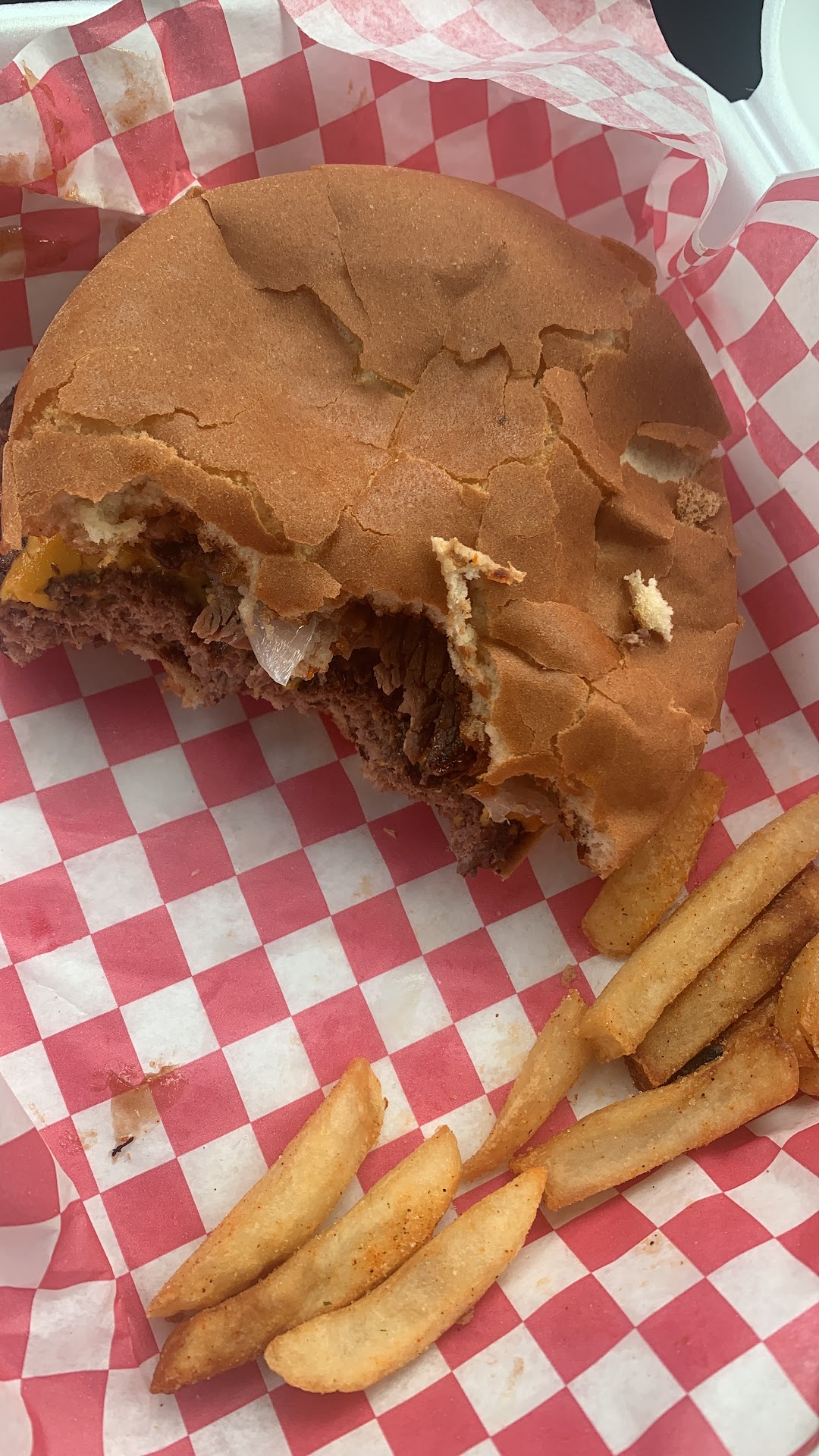Read moreLuv this place. The OMG burger is the absolute BEST burger I’ve ever tasted. It’s comes topped with brisket or pulled pork and 2 Crunchy onion rings drizzled in this flavorful bbq sauce. The portion is very nice and priced well. I just learned about this restaurant less than 2 weeks ago, and my fiancé and I have eaten there 4 times already. Very consistent with their flavors and the customer service is top tier. The owner is very personable. The cook is so very nice he remembered my order. Luv Luv this place. Oh, did I mention the cleanliness… no dirt build up anywhere not even in the attached covered patio… no spiderwebs!!! This will be my go to place whenever I’m...