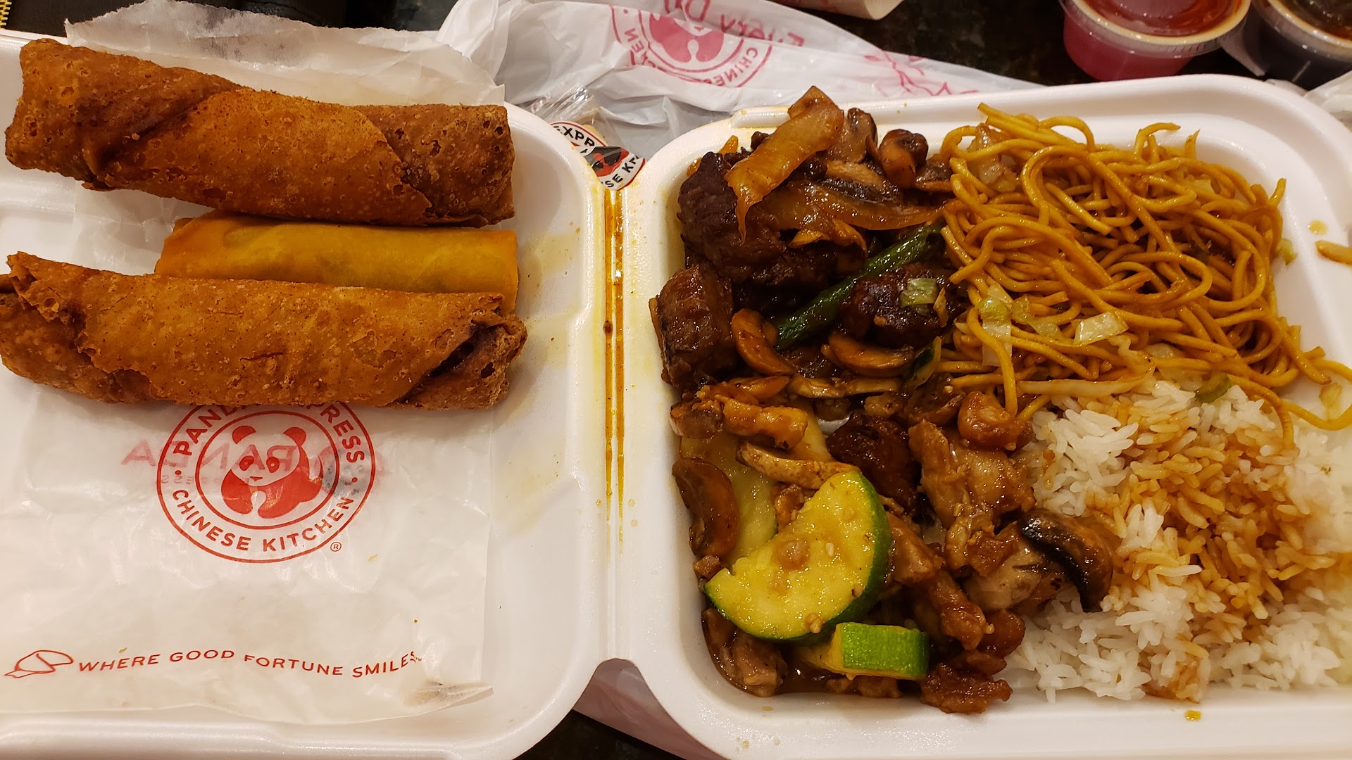 Read moreSo the food was pretty good actual chow mein Panda white rice I had mushroom chicken and steak were really good...but there was also supposed to have the beef and broccoli but somehow that got misconstrued so I never got my beef and broccoli! It was actually written on my plate, I asked for the bigger plate, which has three meats but I got my 2 meats my half noodles have rice and I got the veggie spring rolls as my third meet side that's not what I wanted but when I went back to say hey I never got my 3rd meat the girl says oh well you're going to have to pay more because they put your spring rolls as your third meat, I'm like well that's not what I wanted but whatever I'm not paying more. I don't know why the person at the register didn't look on my box, the girl wrote the three different Meats! why did she not ask me if I wanted to change my mind anyways, then I got two egg rolls, big mistake! They should call them Ginger egg rolls instead of chicken egg rolls because they are hardcore filled with ginger I could not even finish the second one because it was so pungent. Then when I ate my veggie spring rolls the outside was really good and crunchy and the inside had good flavor but was mushy on the inside which was not a texture I was expecting I only ate...