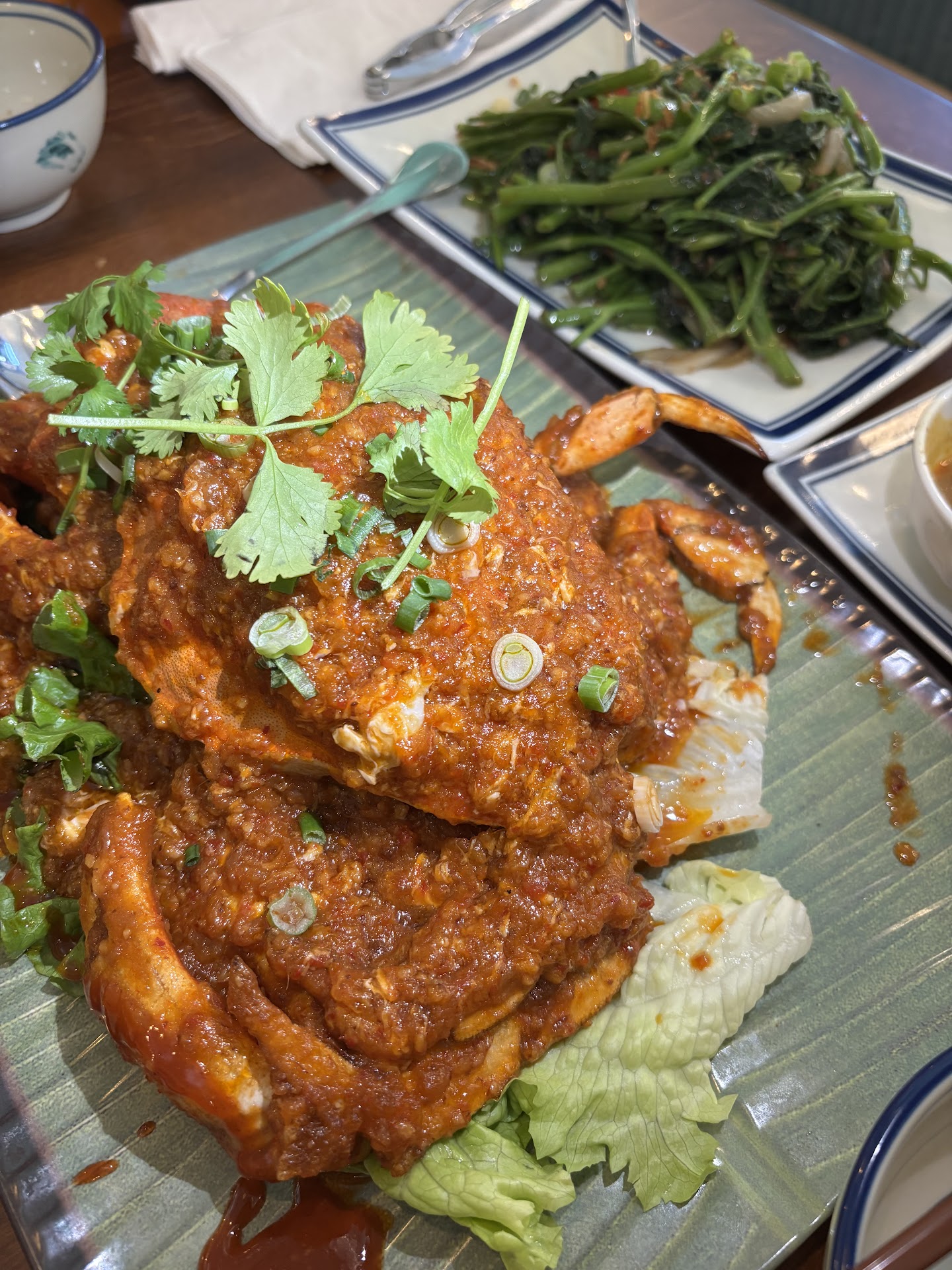 Singapore Spicy Crab An absolute showstopper! This is a dish to impress (definitely too messy for a date, LOL). The waiter even showed us the massive crab we were about to indulge in before cooking, which is always a good sign. A good crab should be plump and flaky (not stringy), and the sauce slathered on top was heavenly! I would describe it as a combination of thick egg drop soup and sweet chili sauce. It was so delicious that we even enjoyed it with riceâtruly a testament to no waste left behind!