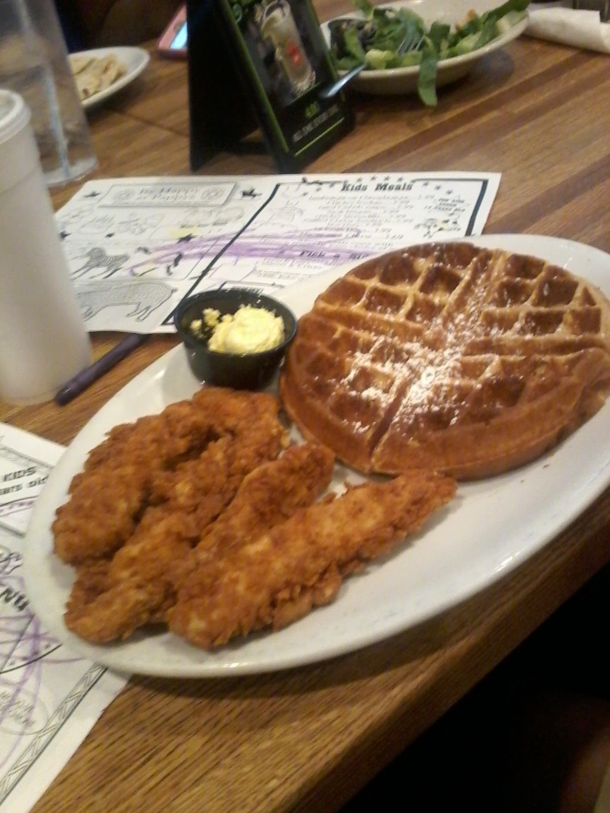 For our entrées, I got the chicken strip platter, which I didn't realize how much food I was getting with it! If you want to split it, get this size portion, but if not, get the basket version. It came with fries and an additional side (I chose mac and cheese so the baby could eat off my plate). You can choose honey mustard or gravy for dipping, and I didn't particularly like one or the other. I kept dipping back and forth. Mac and cheese is creamy and delicious, probably the best part of my meal. Chicken was not as salty as I would have liked. I got my fries loaded with cheese, green onions, and bacon, which was okay, but still not the best. My husband got the chicken fried steak, which is "5th best in the state" according to the menu. He said it was decent, and neither of his sides were up to his standards. He said most things lacked salt, which was his biggest problem.