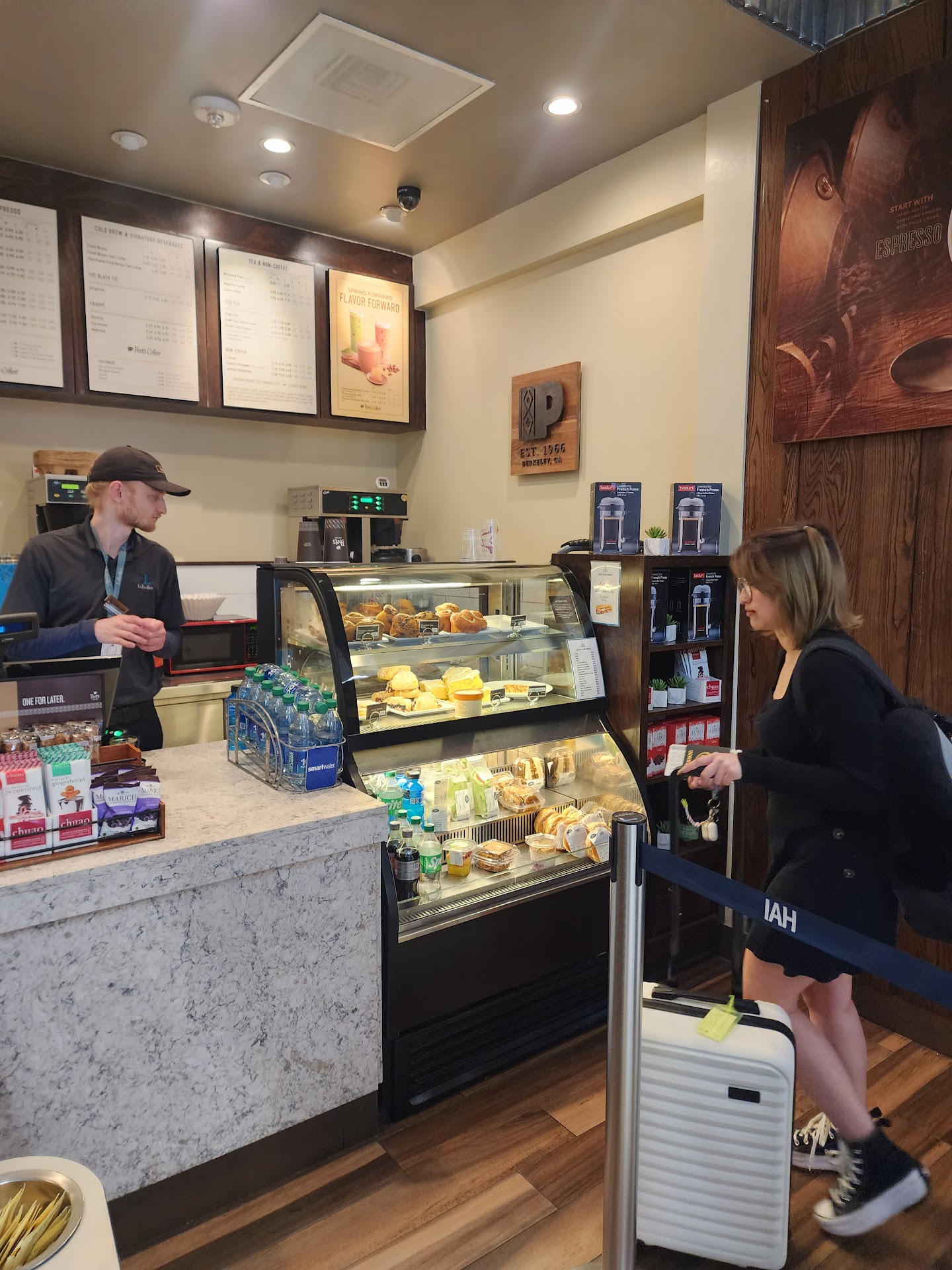 On Sunday, April 16 approximately 3:00 PM, I entered the Peet's Coffee, Terminal B at IAH. There was a tall young man and a short heavy set girl there. I watched the man waiting on a customer in front of me and then he walked to the back room. During this time me, a lady behind me, and 4 United workers were all standing in line waiting to be waited on. Approximately 5 minutes later the guy came out and finally waited on us. I even told him that there were others that walked away because it was taking so long. He stated, "I had to wash the spoon it was dirty". He had no care in the world about loosing customers or anything. The girl made the comment she was off work so she wasn't worried about it. Needless to say I ordered a coffee and the lady behind me ordered the same thing. The girl told the guy they were out of the vanilla and he told me that he only had sugar free vanilla. I changed my order as did the lady behind me. The problem with this experience was the way both individuals were in regards to customer service. Neither one cared about loosing customers. I am in that terminal quiet often as I fly back and forth between work and personal but will make it a point to never enter the coffee place again if those two individuals are working. Horrible experience and customer service...
