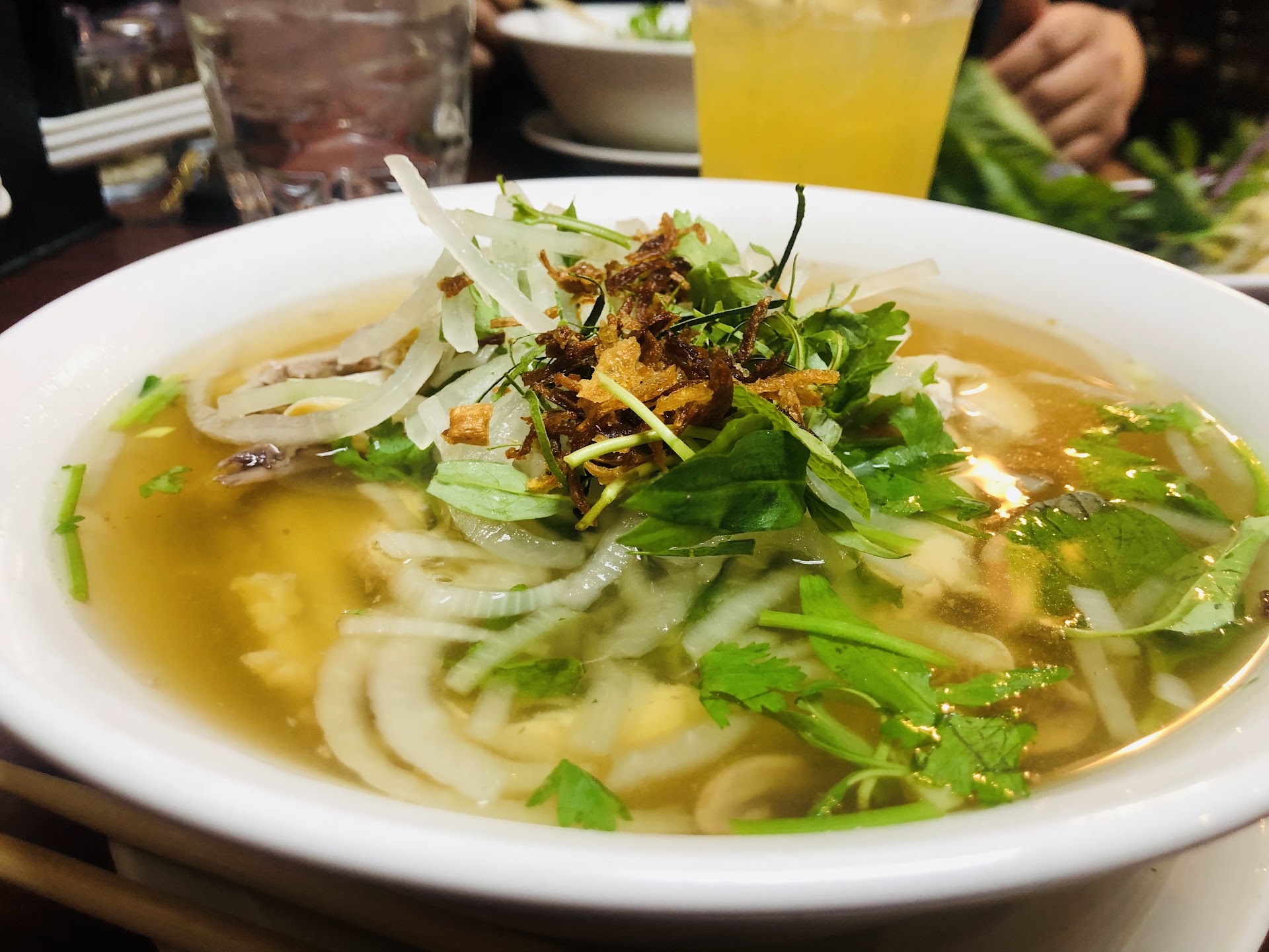definitely not worth the price for two. yes this place is opened late (12am) and the take multiple forms of payment which is why we decided to give it a try and bc it had a 4.4 rating. they guy was attentive in the form that he suggested a sea food like pho, but had i realized they didnt offer beef on the menu i would have suggested we bounce. we both decided to order two chicken pho and an order of 6pc egg rolls and two lemonades. passion fruit + a strawberry lemonade. both were super strong. it was like drinking straight syrup. yes we watered them down. once i got home. it was $4.95 a pop no refills. once the bowls got to the table presentation looks fair. not gonna lie the broth had a great flavor. what i wasn't use to was having a chicken cut up with bone and skin still attached to the chicken meat. that really threw me off only bc the skin looked sus and didn't have great favor. not that we were trying to chomp on that, to each their own. and i get that maybe thats what gave the broth its flavor but for $11.99 it really threw me off. the noodles had the same texture as the onion slivers which threw my visual off. i did have about a cup of the broth sipped down but that was it. the egg rolls were nice and hot, crispy good. and that was about it. those were about $7.99. we paid our tab and left. guy was busy prepping to go orders. we could of said something but i understand it just could of been a different variation of what we're use to considering we've had pho at MANY different place including around the area. im just speaking on my experience and just saying not what i expected. not my type of version. on...