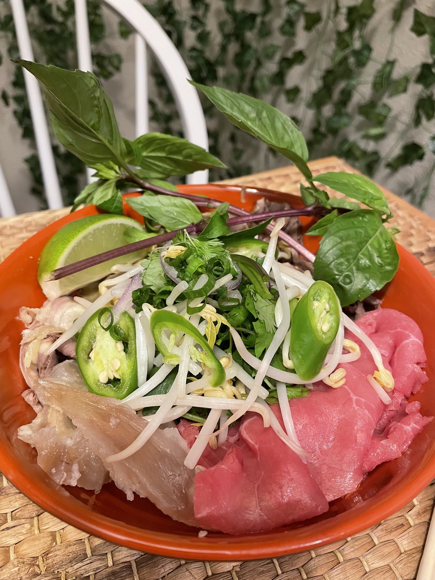 I ordered the large #18 pho which included eye round steak, soft tendon, fatty brisket, and well done flank. The hostess was very kind. Food came out in about 10 minutes nicely wrapped.