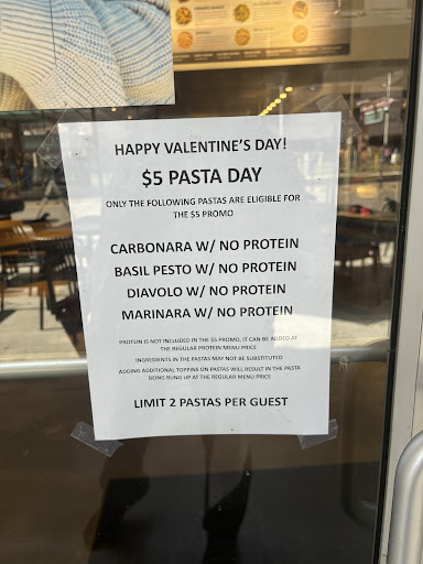 Read moreOverall good experience. The staff could do with some customer service, I was not greeted until I reach the cafeteriaesque counter. I was instantly overwhelmed with choices as what to eat. It's an Italian street food place. Staff could have asked if it was my first time, but they did not. I had to ask them what was what. I ended up ordering the carbonara with spicy crispy tossed chicken. I was looking for spicy and lucky the cook was able to describe the chicken as spicy, so I went for it. Very nice selection of dishes, proteins and condiments. A bit pricey but hey downtown right. I asked of an drink and just got a cup for fountain drink which was disappointing as I saw they had natural juices available, but were not offered. I was not asked once if I was fine or needed anything, but I guess they are not used to much dine in. Place us ser up nice for dine in. The food was very good and filling. Portion was nice enough and the free refills are great. Definitely will com back to try other menus items but will not be dining in....