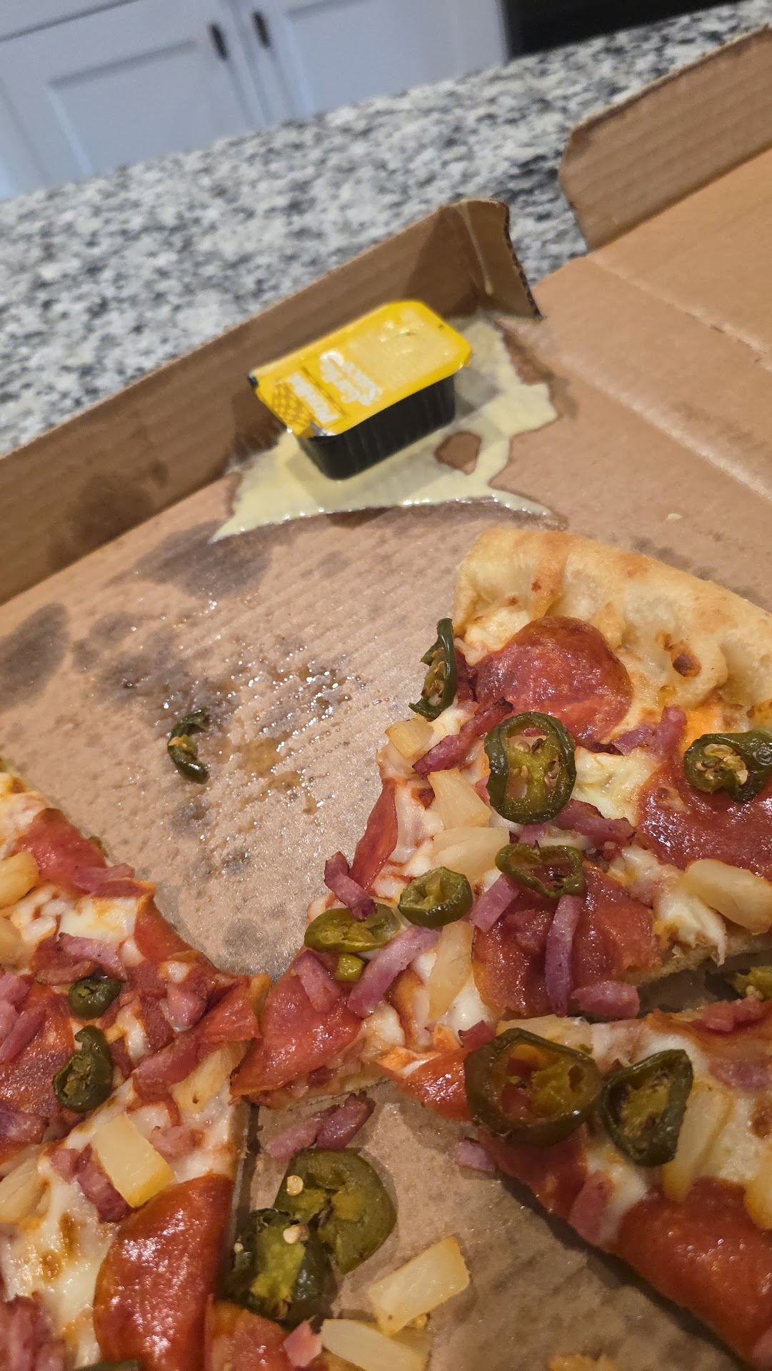 We ordered our pizza at 6:18pm on the app, it stated the estimated delivery would be 7:08pm. The pizza didn’t arrive until 7:37pm!!! We love literally 3 minutes from the store. When the pizza arrived it was so greasy and tasted as if it was under the heat lamp for more time than needed, the cheese in the stuffed crust was so tough it wasn’t even melted, it was more like rubber. There was hardly any cheese on the pizza itself, and the slices were not even cut correctly. Highly disappointed with this.