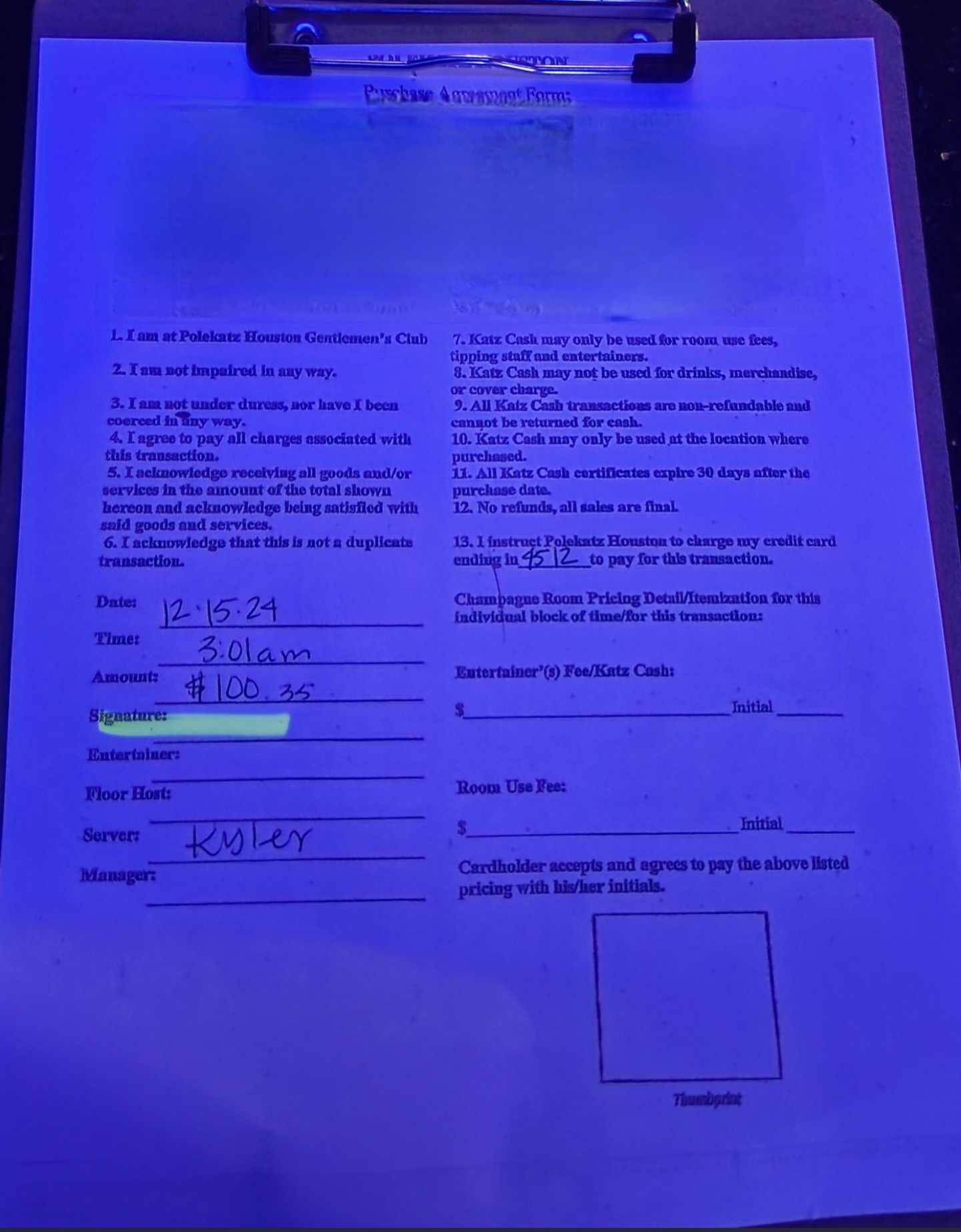On top of that, the service was terrible. They were selling drinks way after 2 AM, which I thought was illegal in Houston? They even tried to get me to sign this long, contract-looking thing just to pay for my drinks! It was super weird and I refused. I actually took pictures of my receipts and everything because it seemed so sketchy. The prices were insane, like seriously overpriced. The dancers wouldn't even come over to my table unless I bought a drink first.