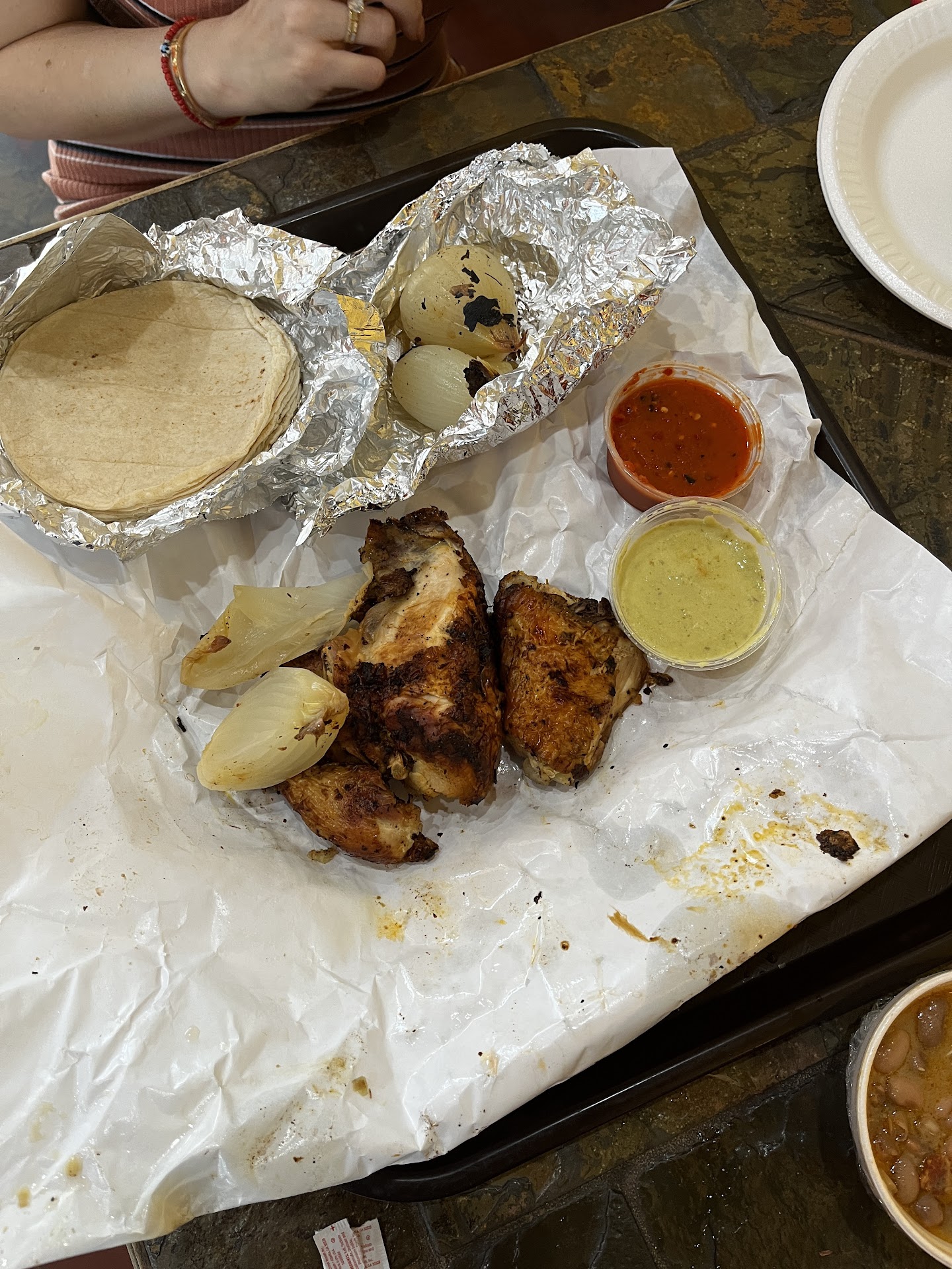 I always come here and get the medio pollo (half chicken) which is 7.99. It comes with a half chicken in some kind of wax paper, a charred whole onion. plenty of corn tortillas, a green crack sauce, lime, rice, and soupy beans. You can probably eat this for two meals. The whole thing comes in a plastic bag. The chicken has bones and is perfectly charred. You just pick it off and add it to the tortilla with the onion and green sauce. I love the beans here. It is one of my favorite items. My wife loves the green sauce and makes me get extra sauce (50 cents) so that she can have it with tacos at home. The staff is very friendly and speaks english.