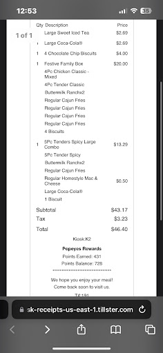 Read moreNo chocolate biscuits, missing a 4 piece tender , only chicken legs for a 4 piece .all of this from the festive family box and also got a 5 piece (spicy) chicken tenders they were regular . I’m not the person that reaches over the counter to get my cups unless I ask if I can get them so I go and ask for them the lady for the drinks 2 coke and 1 sweet tea. The very short lady I suppose that’s the manger says in Spanish why don’t they do it them selves . The cups were never handed to me, There’s no sweet tea where the drink dispenser are at . So I ask her if she can fill them for me and that’s when the manager says what I just stated , she tells she just puts the tea to start making it’s self , I wait a few minutes she comes back to tell it’s not working , I know it’s just sweet tea , she tells me if I want to change it I said a Dr Pepper I go fill it up . Nothing wrong with me filling the cup . But I still get a messed up order and one...