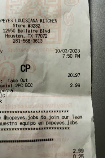 Ā Ā Ā Read moreI drove to this Popeyes on Bellaire and Dairy Ashford for Sunday lunch/dinner because I couldnāt order online and use my coupon. When I arrived after calling they had no Chicken prepared and said it would take 15 to 20 minutes. I was asked if I wanted to wait. I said I will wait but I think yāall shouldāve had Chicken prepared and when you see, the chicken is getting low, other chicken should be dropped. Since I have to wait 20 minutes, could I have a complementary drink, the young woman standing near her answered and said no.. I asked to speak to the manager and she said I am the manager. I shared that in the past, if there was a wait, a complementary drink was offered, and she said no, we donāt do that anymore. Thatās in the past. Since youāre not prepared with the chicken, it would be a nice gesture. The manager said itās on you because you said you would wait. The Young manager said I can give you your money back if you want me to and I stated that Iāve driven all the way over here to get the chicken so of course I donāt want to wait but I have to wait since you donāt have it prepared. I thought the manager needed more training in dealing with people as well as managing too. I finally got the chicken, which was good, but the young manager was rude and needs training to prepare Chicken before...