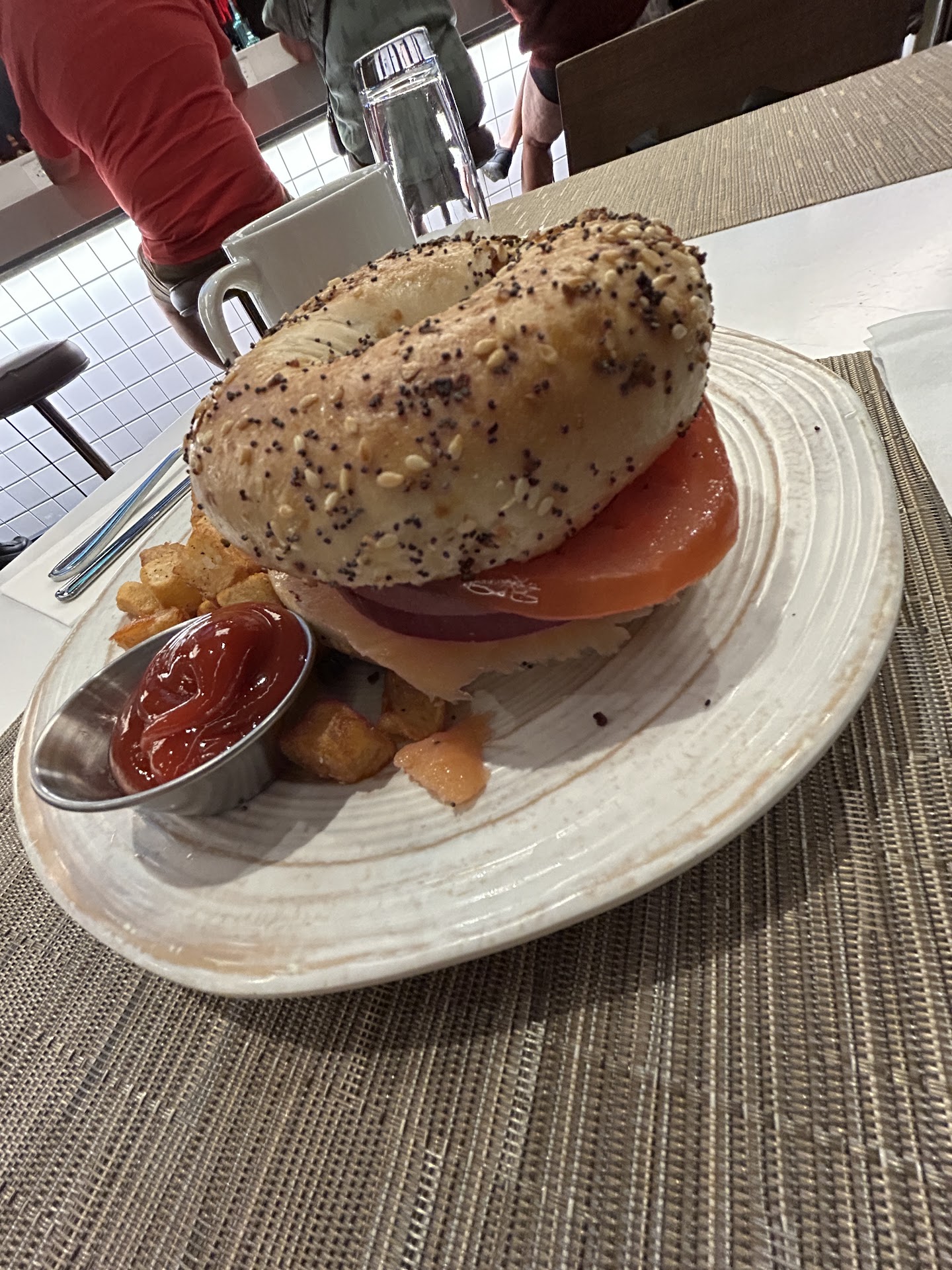 I typically wait a few days to review a place. I give myself time to think about what I really thought about an experience at a place. Especially if it was not good. I left about five minutes ago and wanted to go ahead and do this. Just walk past and go someplace better closer to your gate. I will say upfront everything wrong with this place is management. I respect them opening early. A lot of the time there is not many options before 6am at any airport. If you are near the screening entrance and plan on opening early, make sure you have the staff to do so. Or block off tables so they do not get overwhelmed. When I arrived at 5:15 am there was only one server. Every table was pretty much full. That poor lady was running around and stretched thin. She was doing great for what she was dealing with. Second, the food was completely bland. I ordered the “Big Poppy Bagel Sandwich” with a side of breakfast potatoes. I never had lox, capers, red onions, cream cheese, and tomatoes that tasted like absolutely nothing. The only thing with flavor was the bagel. Which was not the right bagel. I ordered the garlic and they gave me an everything bagel. The bagel had decent flavor, but was tough and chewy. The cream cheese was hard as a rock. Which made it hard to smear since they give you a flimsy plastic knife. The potatoes were okay. Just a little stale from sitting under a heat lamp for a while. The bagel was $20 and definitely not worth it.