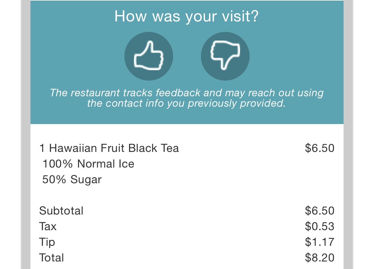 Got my usual hawaiii tea. And when prompted to the tipping menu. I selected NO TIP. But when I check the receipt. My total was 8.20$! TIP WAS ADDED to my bill. I asked the staff and they reported tip is AUTOMATICALLY ADDED, I need to select something to remove it. Which means when the tip screen is prompted, you’re adding ADDITIONAL tip to the automatic 15%. So if you select 15% you’re actually tipping 30%!