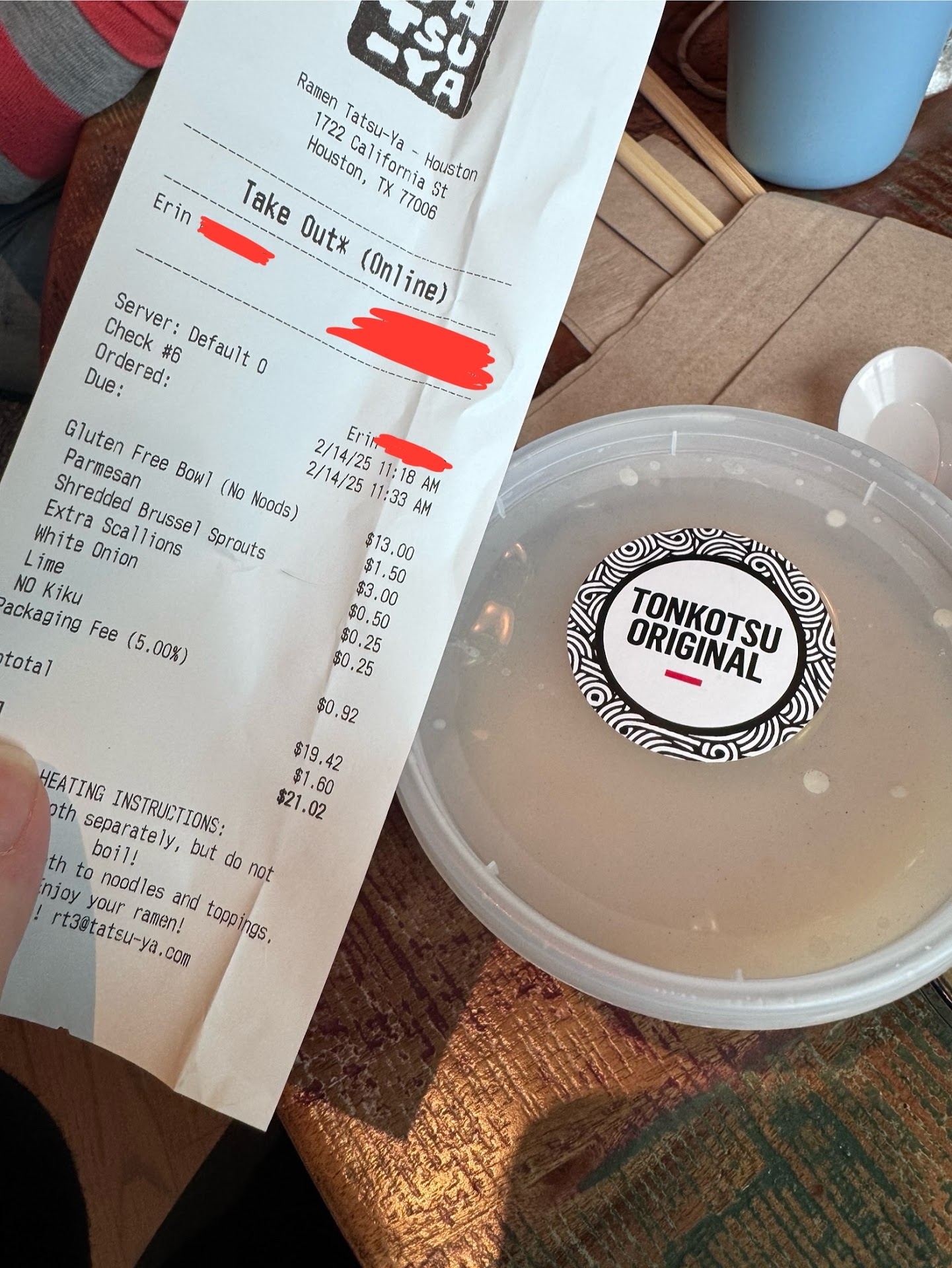Read moreI’ve eaten here numerous times over the years both before and after getting diagnosed with celiac disease. They have gluten free bowl that’s become my favorite and I’ve gotten it for take-out quite a few times recently. The label on the broth always says “gluten free.” I picked up my order today and when I unpacked it, the broth had a label for the Tonkotsu Original broth. This was immediately a concern for me, since I ordered the gluten free bowl and had a different broth. I called the location, but they don’t answer the phone - you have to sit through a recording for a few minutes until you’re directed to leave a voicemail for a call back. Luckily, I live close enough to the location that I just drove back up. I brought the broth with me, showed it to the employee behind the counter, and explained I’d gotten a gluten free bowl and need the correct broth. The employee told me it IS gluten free broth and that they don’t have the labels. I’m guessing they just ran out since I’ve picked up orders with gluten free labels on them before. I mentioned that this is a huge concern for people with allergies (I was rude about it, to be honest, but I was angry about the lack of concern). How am I supposed to know that this broth is apparently gluten free when THAT particular item on the menu is NOT labeled gluten free? There were two other employees nearby and no one really seemed to care or understand why the label was important. I left and ended up tossing the broth rather than risking eating it because at that point, I lost my trust in this restaurant. People with allergies, especially celiac disease, rely on food safety when eating out. So when an item on a menu is labeled gluten free, and we get given something else from the menu that is NOT that gluten free item, it’s an extreme concern. You’re telling me there wasn’t a sharpie or piece of tape anywhere in the restaurant that they could have written on the container that it was gluten free so that the person picking it up would know that attention was paid to their meal to have the CORRECT label on it? While some people choose not to eat gluten, others don’t have a choice and have serious repercussions from eating gluten. If you’re going to offer a gluten free bowl, label it appropriately for take-out orders. I won’t be returning to Ramen Tatsu-ya. I can’t trust a restaurant that doesn’t take caution when dealing with allergies and gives...