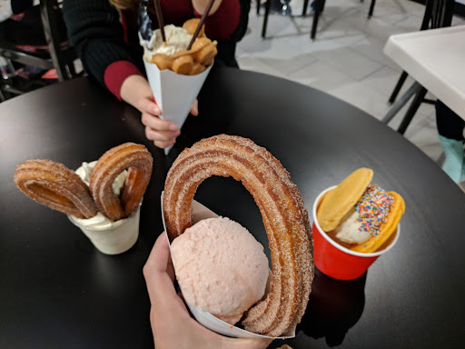 This place combines the best of all worlds churros Donuts macaroons and ice cream with wild toppings like Fruity Pebbles and cookie butter. If you want to go spike your blood sugar levels just looking at this store will do it for you. I love churros a lot and this place did not disappoint with the giant pretzel shaped churros. They Even have a churros coated in Fruity Pebbles.