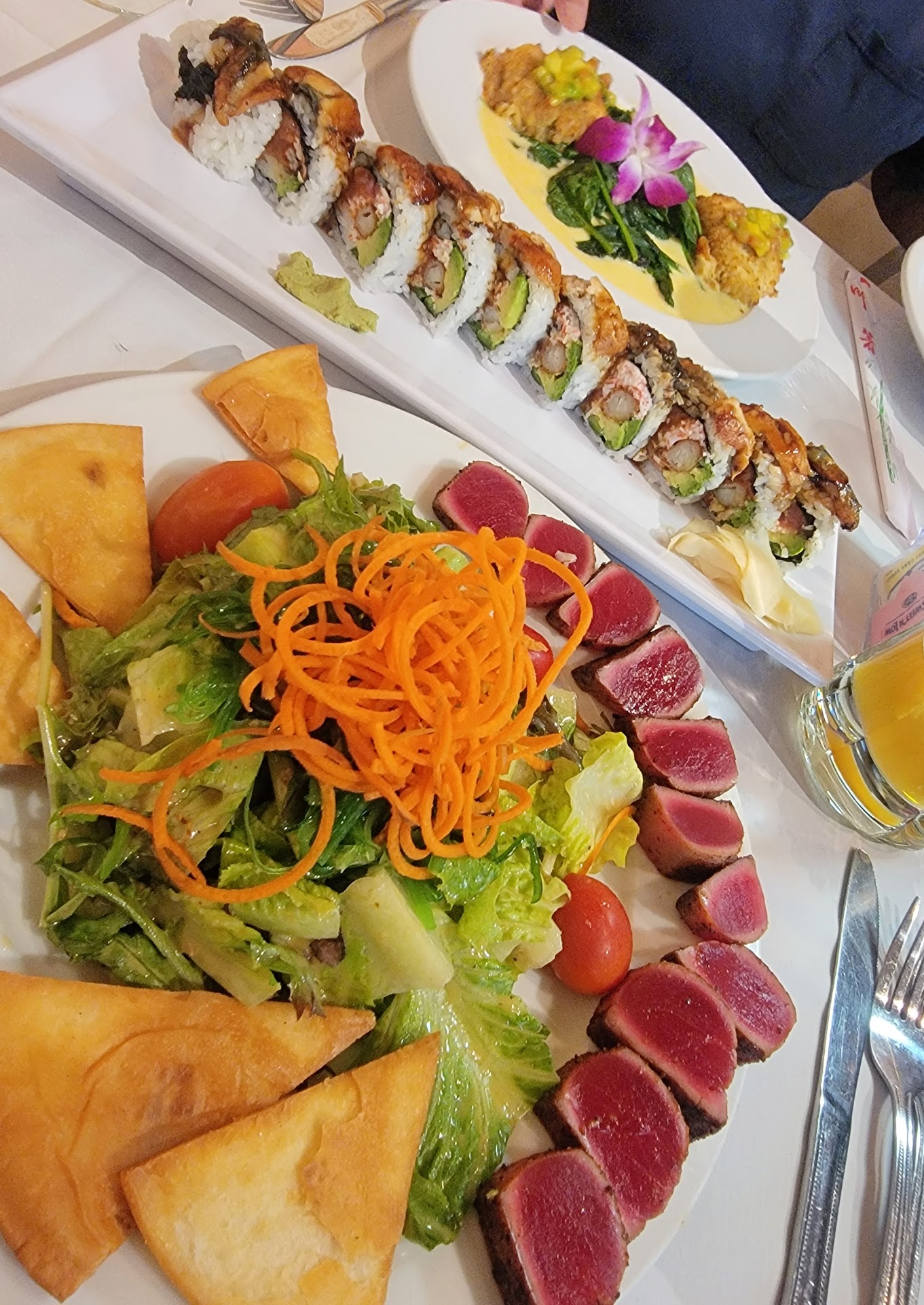 The Menu.. it was way too much stuff to read through. Sushi and seafood and apps. We tried the mango salsa topped crab cakes, seared ahi tuna salad, Eel lover roll and the stuffed mushrooms. The roll was amazing, everything fresh and it had 10 pieces. The fish, tuna, crab and unagi was plentiful and well worth the $15. The crab cakes were good, but a little bland. They needed seasoning and some acid. The Ahi Tuna salad almost was really good. The ginger dressing was the star. I think if maybe the tuna was sliced traditionally in thin slices and layered over the salad with maybe a ponzu sauce, it would have been killer. It came with a couple fried tortilla chips and a bread roll. Honestly, save the money, ditch the roll and add a little sea salt to the chips! Last, the stuffing in the mushroom was okay but the outside was weird and the sauce tastes like cream of mushroom soup from a Campbell's can. Maybe they were frozen?