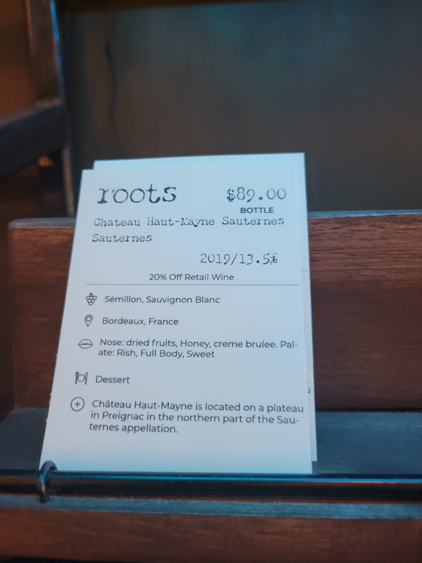 Not exaggerating when I say Roots wine bar is my new favorite restaurant. The experience and atmosphere is perfect for really any occasion, professional but so chill. Staff is not pushy yet always really helpful when you need it. The wine selection system works out great for someone like me who loves to sample everything (it's an automated system that lets you choose 1oz, 3oz, or 5oz pours).