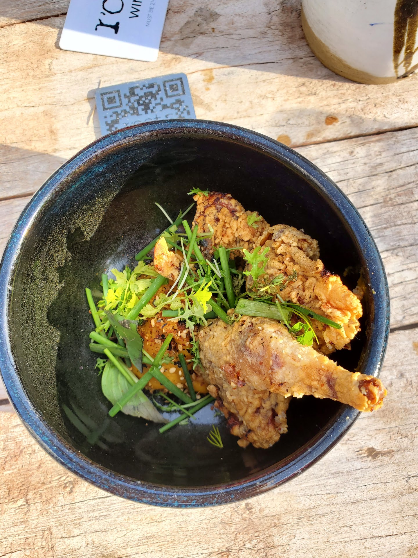 The crab with Carolina gold rice, amazing... plain and simple. Wagyu tartare with bread so perfectly toasted you'd think they had a cook specifically focused on the bread alone. Kaarage quail that paired so harmoniously with sweet potato dip you end up kicking yourself for wishing you came up with it yourself. The Duck confit which looks like it's gonna blast you in overpowering flavor but then surprises you with such balance your mouth and brain take a second to realize the Zen happening between them. My only regret with the food was not ordering the entire menu. Every dish is so balanced in flavor and texture it makes me look back at my restaurant career and wish I had this level of attention in the kitchen. Seriously tho, it's not just the amazing wine, not just the perfectly cooked food, but the staff also just makes you feel like you're hanging out in someone's backyard...someone who happens to have the best wine and food and chillest friends around.