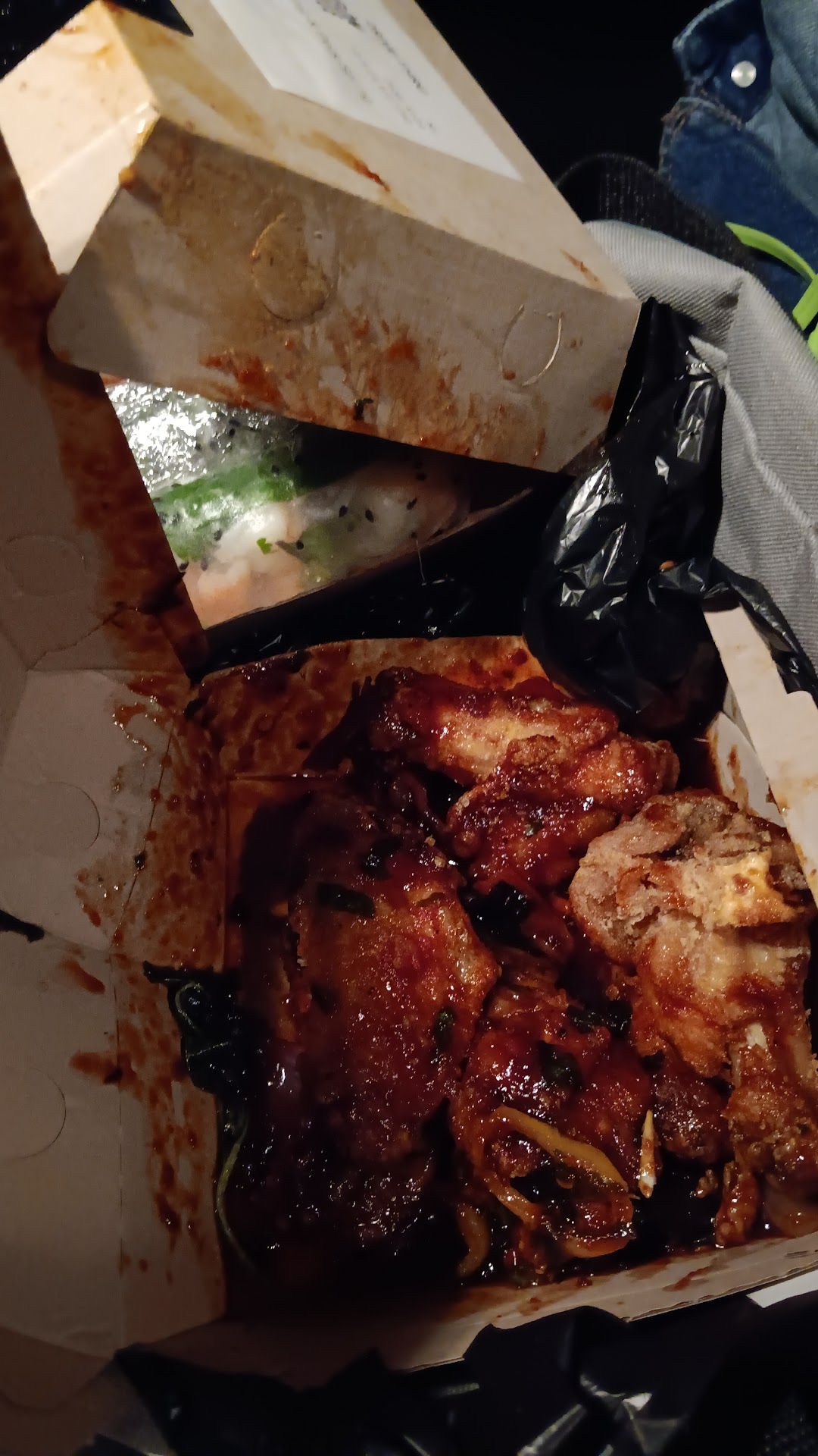 I am LIVID! THE only reason I'm not back over there right now is because I'm am charging this fool of an electric car. Which will also get a bad rating. I ordered garlic spicy wings..waited 10 mins. And they actually looked like they had been picked up off the floor and slung in a box. There was sauce and fingerprints all over the box. Completely disgusting in appearance š. The shrimp and chicken egg rolls are completely bland and the peanut sauce had some thing red in it. Whomever packaged my food didn't give a damn! I am very disappointed and disturbed by the presentation...and if yall are closed in 50 mins it will be tossed un eaten in the trash. 22 dollars wasted. I'm trying to figure out how to add this photo..this is ridiculous š¤¬