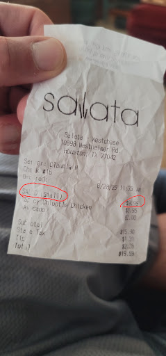 Read moreMy boyfriend and I ordered two regular salads, and this was my first negative experience at salata. I eat at Salata all the time, but this specific location was the worst dining experience ive genuinely ever had. When it came to the ranch portion of the bowl building, I requested for the classic ceasar ranch to be on the side. Instead of pouring it on the spot, the worker pulled out a container of ranches with no labels. It initially didn’t cross my mind to taste the ranch before I poured it on top of my salad, so I did and was unpleasantly surprised. I don’t know what ranch it was, but it wasn’t classic caesar, and it was at this point already mixed in. I tried to resolve the issue by telling an employee that I received the wrong ranch, and that I just wanted to get classic cesear. They proceeded to try to charge me for extra ranch, I politely told the employee that they didn’t give me the right ranch in first place. They ended up having to ask the manager if it was okay and handed me ONE correct ranch. I tried to fix the salad, but at this point a replacement would’ve been better because it tasted awful. My boyfriend also complained of a sour taste in the ranch dressing, but his was mixed in so im not even sure what happened there. I’ve never had a worst salad in my 3 years of eating at Salata ordering the exact same thig everytime at other locations. Overall, the experience and food was so bad I didn’t even want to ask for a refund, I just wanted to leave. Please be cautious if you are...