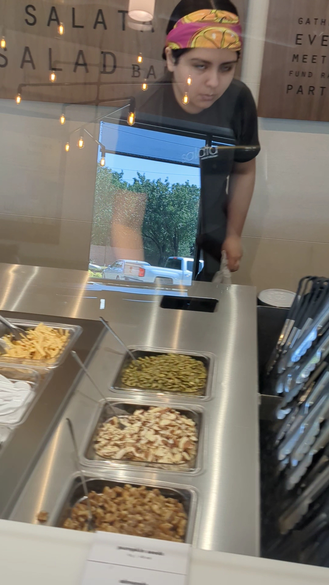 So when we get Salata it is either at this location or the one in Cypress at 1960/290. I have noticed that both of them never add the bacon to the cobb salad when it is ordered to go. So everytime I pickup the order I check and have them add the bacon, every time. Tonite picked up 2 salads from Eldridge location, the regular size cobb for me and a build your own small for my wife. When I arrived they had finished building mine and were working on my wifes. I looked and sure enough no bacon, not only that no egg and no blue cheese. When they bought my wifes salad it was pressing on the top of the small container, mine had a good 1" space betwen the salad and the top of the container. So yeah probably my last time doing Salata. They are not consistent and I almost feel that the leaving off of the more expensive ingredients on to go orders is some type of strategy. Like who is going to bring their salad back if you forgot the bacon. But that aside, just the general lack of consistency is infuriating and will pretty much prevent me from ordering...