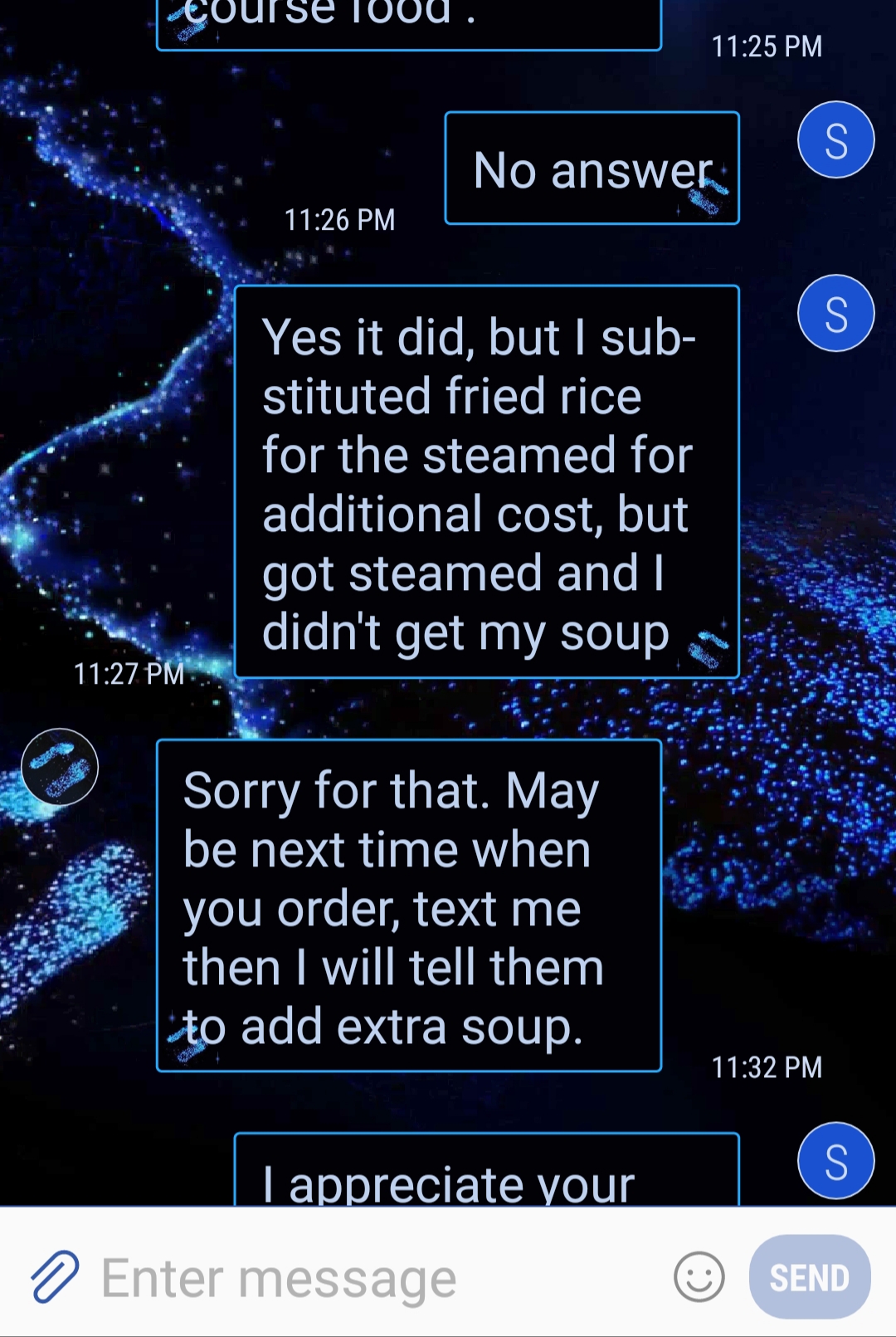 ย ย ย Read moreI had been a returning customer for a while now, that was until today. I had a small things happen after new management took over but I chalked it up to a late order. Well i ordered this evening and an hour later food still had not arrived, so I called. Girl who answered the phone barely spoke English and couldn't really understand me so she could not find my order and kept trying to get me to place another order. I guess the other girl got off the phone and I heard them going back and forth but still they could not find my order, even though the girl who took my order told me she was going to double check it before it left. I told them to go ahead and cancel the non-exsistant order and if the driver showed up I would send him back. Driver showed up 15 mins after this, as I was sending him back, they called to tell me he was on the way. Told them I was sending the food back and never ordering again. They did not but say OK. I was stunned, I have been ordering from this place for over a year... this new management is horrible and I will not order from them again, especially if they keep sending me burnt sweet & sour...
