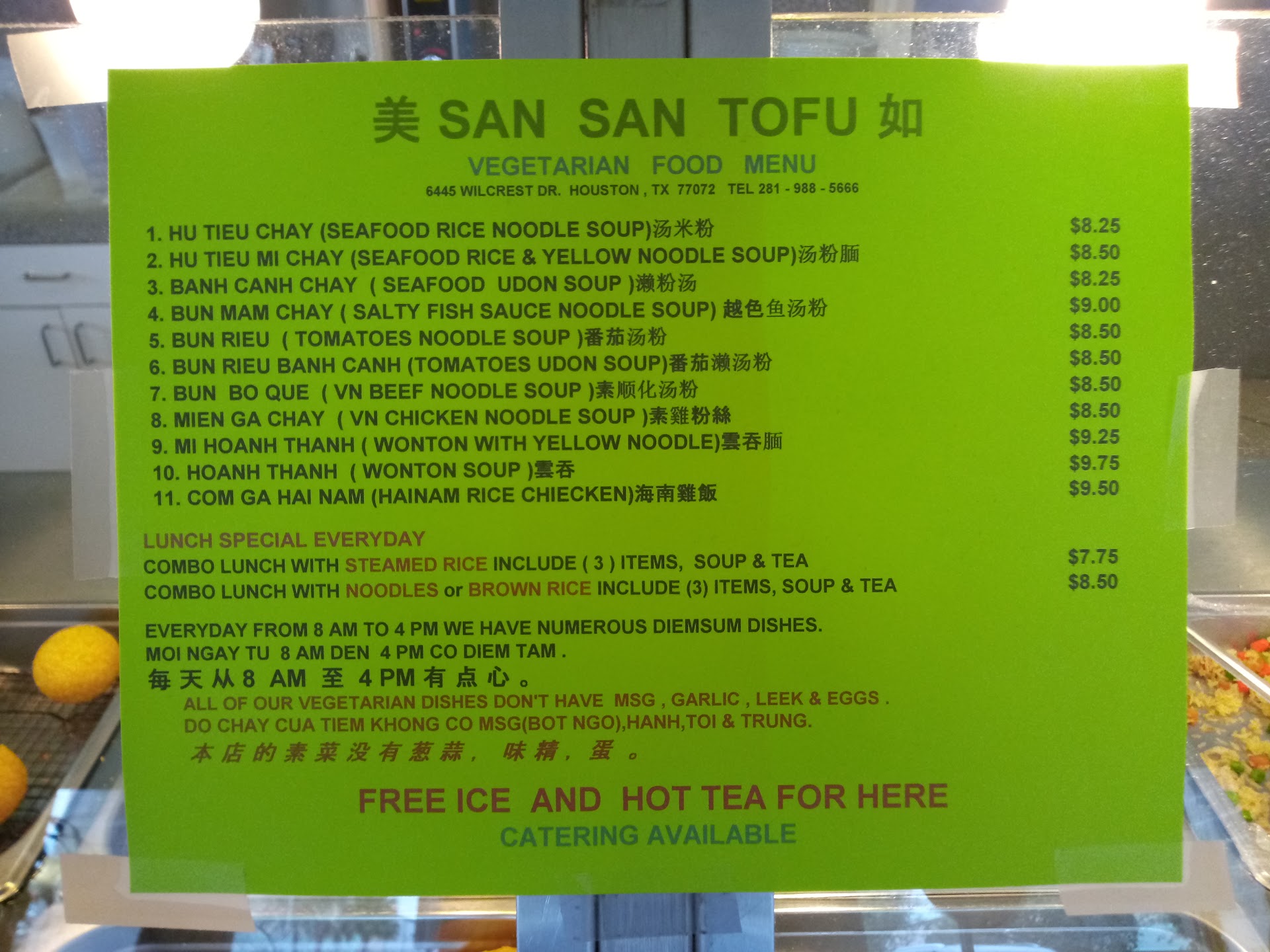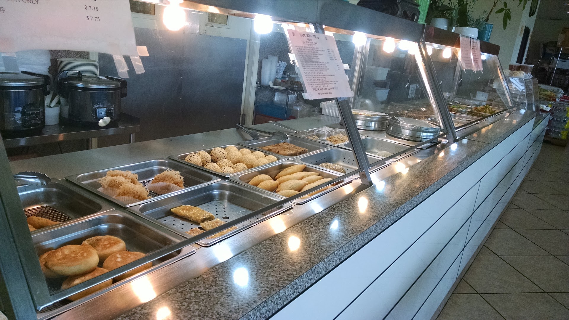 ** SanSan overview: stand-alonw building. Nice and clean parking lot. Inside is a mini-mart of dry and frozen foods along with prepared snacks and lunch boxes. I didn't see much fresh produce. A small restaurant in the back with tables for diners. Pre-made foods are shown behind glasses of about ten selections. Offer vegetarian dishes that look like the real thing, like Barbeque, Fried Rice, etc.