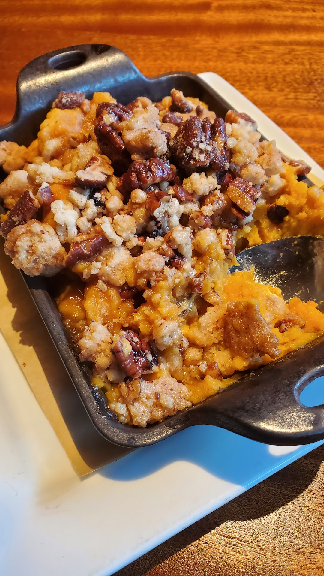 Immediately after Jessica brought our entrees, the (seemingly coreographed) Executive Chef personally brought out and presented a FANTASTIC-TASTING (share-able) Cast Iron Skillet Side Dish of New Potatoes we had also thought to try, with a sophisticated cheezy creme sauce and bacon bits. We DEFINITELY recommend that!