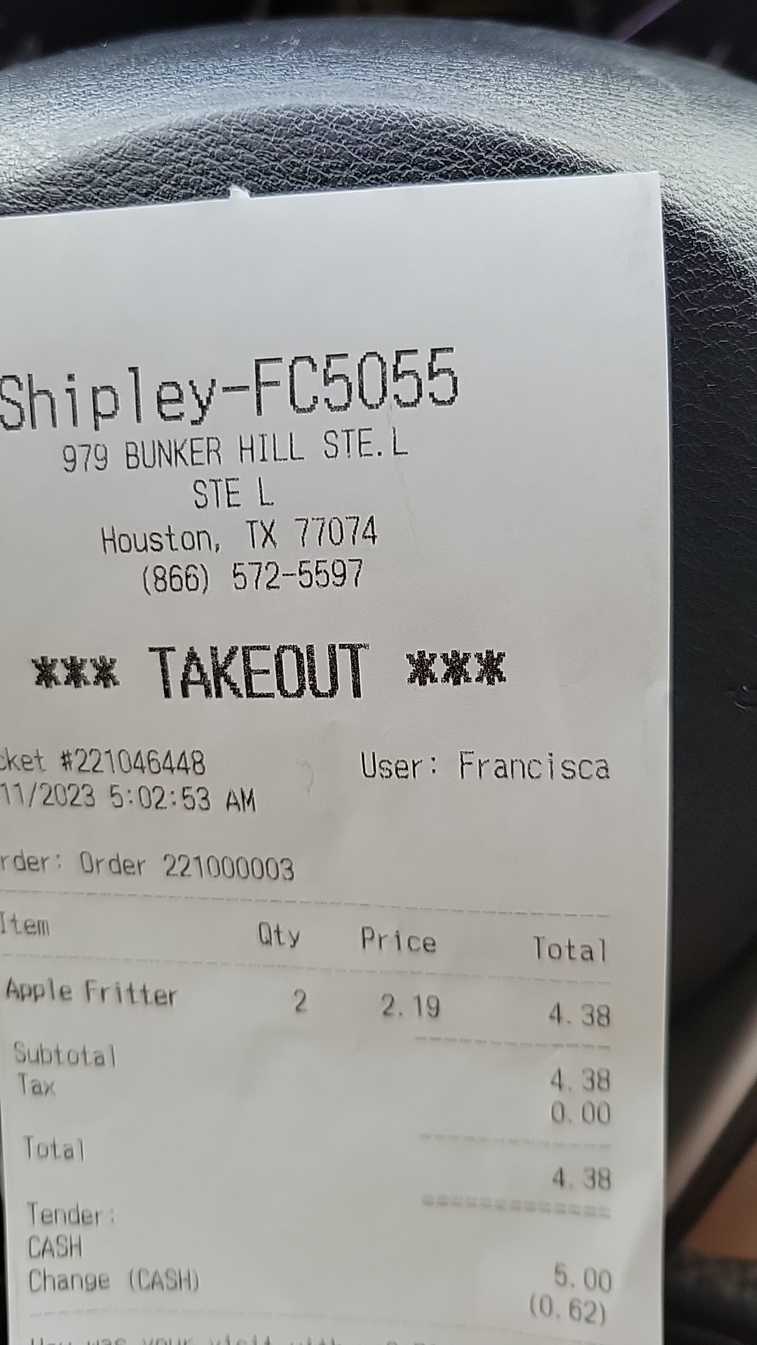 Read moreCame into this location. My first time I had a hard time finding a parking spot finally found one and this little blue Nissan actually took the space away from me. It was in front of the cleaners next-door found out that the lady was working at Shipleyâs whenever I went in to make my purchase, she looked at me very puzzled and very unfriendly. I made my purchase received my donuts they were cold. The whole experience was not pleasant. The lady in the blue Nissan stayed in that spot for quite a while, because I noticed it whenever I met my friend a little later in the day for lunch at Island Grill I do not know the employees name but I know she was in the blue Nissan and I believe the license plate number was RZR6406. I believe she should not be parking in front of the establishments since they have such limited parking. I thank...