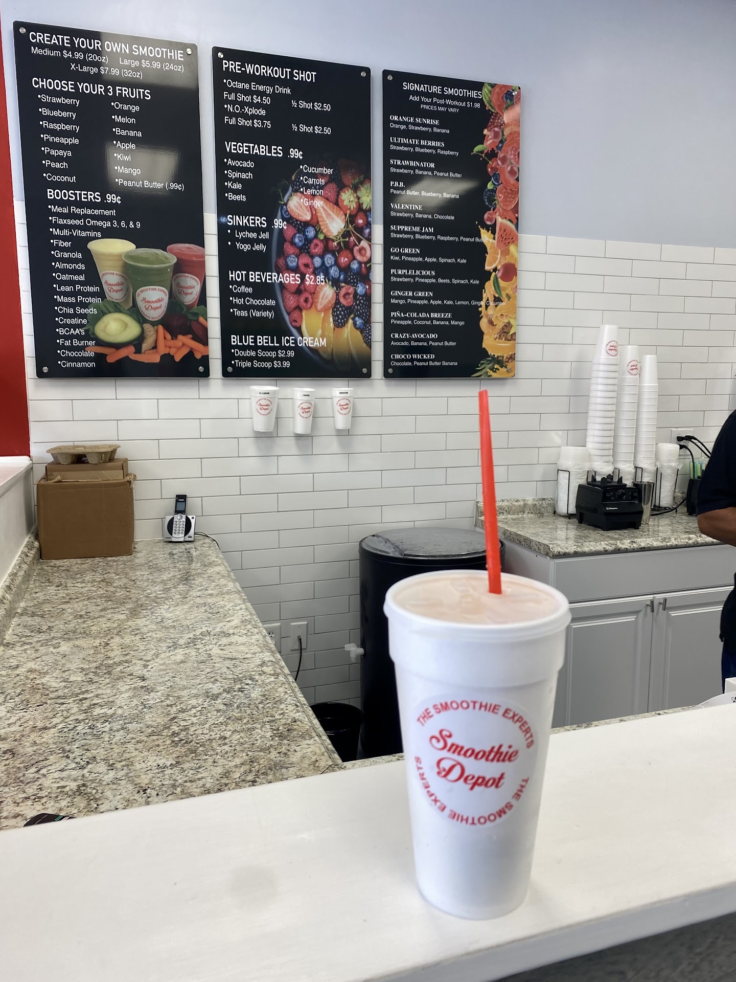 Upon pulling into the parking lot, I could feel the energy of Smoothie Depot reeling me in. Kind employees outside in the hot sun greeting me and welcoming me inside. Upon entering the store, there was a thunderous “Welcome to Smoothie Depot!” that made me feel warm and fuzzy inside. Then we were astonished by the array of great menu items as well as the build your own smoothie feature. I got the Valentine Smoothie (one of the signature creations) and let me tell you, it was possibly the greatest food I have ever tasted. I gargled this smoothie down so fast, even got a huge brain freeze. After finally being ready to head home the owner (or manager) wished me a phenomenal day along with the same kind individuals outside who just radiated positivity and appreciation for our visit. I walked away wishing I had been more thankful to them because as I mentioned earlier, this was the greatest smoothie of all time. Wishing them well....