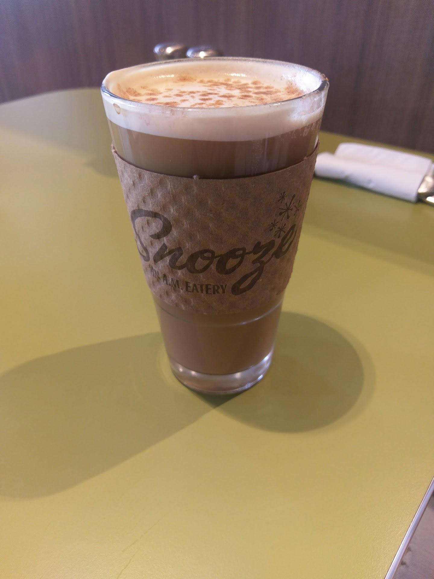 Read moreI really like this place. Just be prepared to wait at least 30 minutes on a Saturday at noon. The food was really good. My daughter went twice in a week and had excellent service and food both times. I had a great burrito that was HUGE. Snooze Breakfast Burrito Burrito Filled with scrambled eggs, hash browns, house black beans, cheddar & jack cheese, topped with pico de gallo and choice of green chili or ranchero. I just requested no cheese, eggs or meat. The only downside is that each additional veggie you add is $.75. I added onions, mushrooms, cilantro, peppers, basil, spinach, and avocado. You see if you are a vegan and want a variety of veggies, it could easily add as much as $11 to your meal just for veggies!! Veggies: arugula, caramelized onions, basil, cilantro, jalapeño, onion, pico de gallo, poblano peppers, wild mushrooms, red pepper, roasted garlic, spinach, tomato, avocado. But if you like large portions, this place definitely delivers. The flavor was really good. I like a lot of flavor. The price was avg.( except fire the veggies).My daughter ordered Benny Goodman - Lox style salmon and cream cheese served over toasted rye and topped with poached cage free eggs, cream cheese hollandaise blended with sun dried tomato and caper relish. Her friend had Shrimp & Grits - Homestyle cheesy grits loaded with sauteed shrimp, andouille sausage, peppers and leeks, topped with an egg your style!. His was scrambled and it looked very light and fluffy. The drinks are very interesting.... coffee with alcohol, mixed drinks, etc. I had Dirty Drunken Chai Bhakti Chai, Espresso, Steamed Milk, Coffee Liqueur & Cruzan Rum with Almond milk of course. It had a bit of bitter taste that I didn't particularly enjoy. My daughter had one of the bloody Mary's and a mimosa. The Mary was yummy. It even had pickled veggies as a topper, not just celery sticks. Gazpacho Bloody âGazpacho Styleâ infused 1876 Vodka & House Bloody Mix. Choice Mimosa Snooze Sparkling With Orange, Grapefruit, Apple, Lemonade, Cranberry or Pineapple Juice. This location just recently opened and at the moment parking is ample. The interior is cute, but small. There is also patio seating, but it's not covered. We highly recommend this...