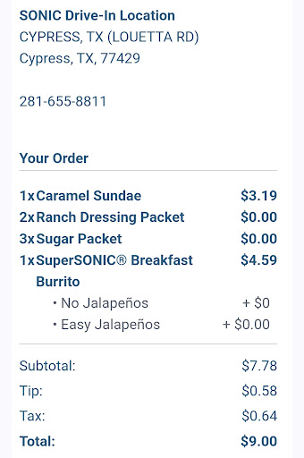 We live about 1 minute from this so called Sonic. So we went down the block and ordered a mini Oreo blast. We got home and realized that we were not served in oreo blast but instead we were served a vanilla soft serve with a little bit of Oreo floor sweepings on top. Well maybe it was something else but anyway there was some black dust on top of some vanilla ice cream. So we went back. The journey wasn't that far after all. But this time instead of going through the drive-thru I went to the tables and press the button and told them what had happened and so I thought this time they would bring out an Oreo blast.