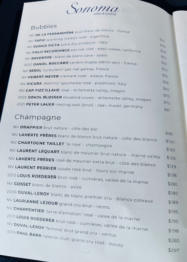 With food, this Sonoma Wine Bar location offers small plates, cheese, sandwiches, etc. Charcuterie boards are a popular option, too, and cheese seems to be the food that most wine drinkers opt for. There is a nice assortment of cheeses, many of which match nicely with the different wines.