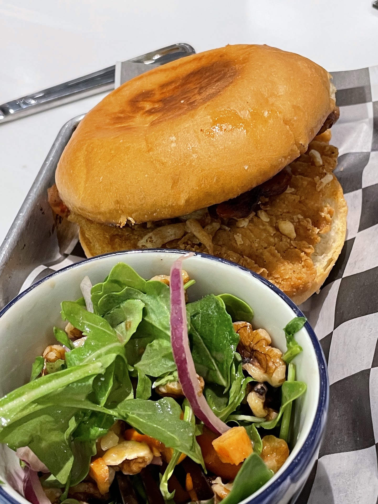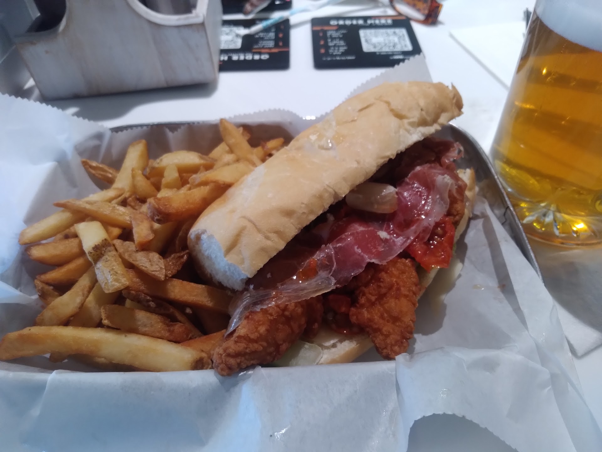 Read moreWould not recommend it. The QR code was not working so was given an iPad to place an order. I was not keen on having to enter my card details into a device that's not my own. Am sure it's fine but made me nervous. A member of staff quoted all the right words to assure me he was there to help but as he repeated his script to everyone it sounded disingenuous. His saying he was going to get me sauce only to immediately have an extended conversation with a fellow diner about wines he had available and those that were no longer available did not improve my opinion. He did not notice me walking across the dining area to grab sauce myself. I had a buffalo burger and fries. Terrible burger and ok fries. Very expensive for what it is. I get the airport price thing but still. Google says this is 10-20$ but that's nonsense as fries are 12$...