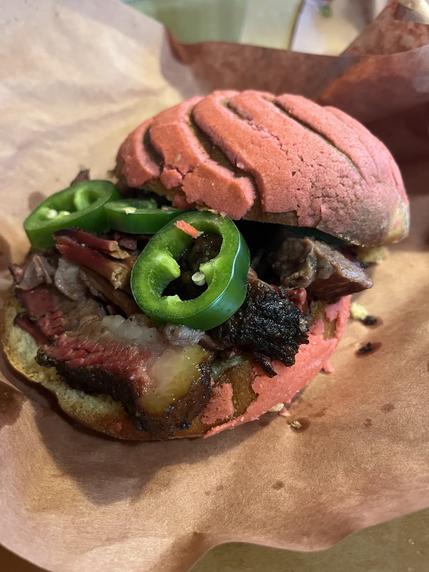 The brisket? Oh boy, it's like they found the sweet spot between not too acidic and not too sweet and not like some other really expensive smoke houses up in dallas that give you a flavor profile of wood ash crust. None of that Texas-sized hype, just straightforward deliciousness on a bun. Simple, yet complex in flavor—like solving a Rubik's cube made of meat.