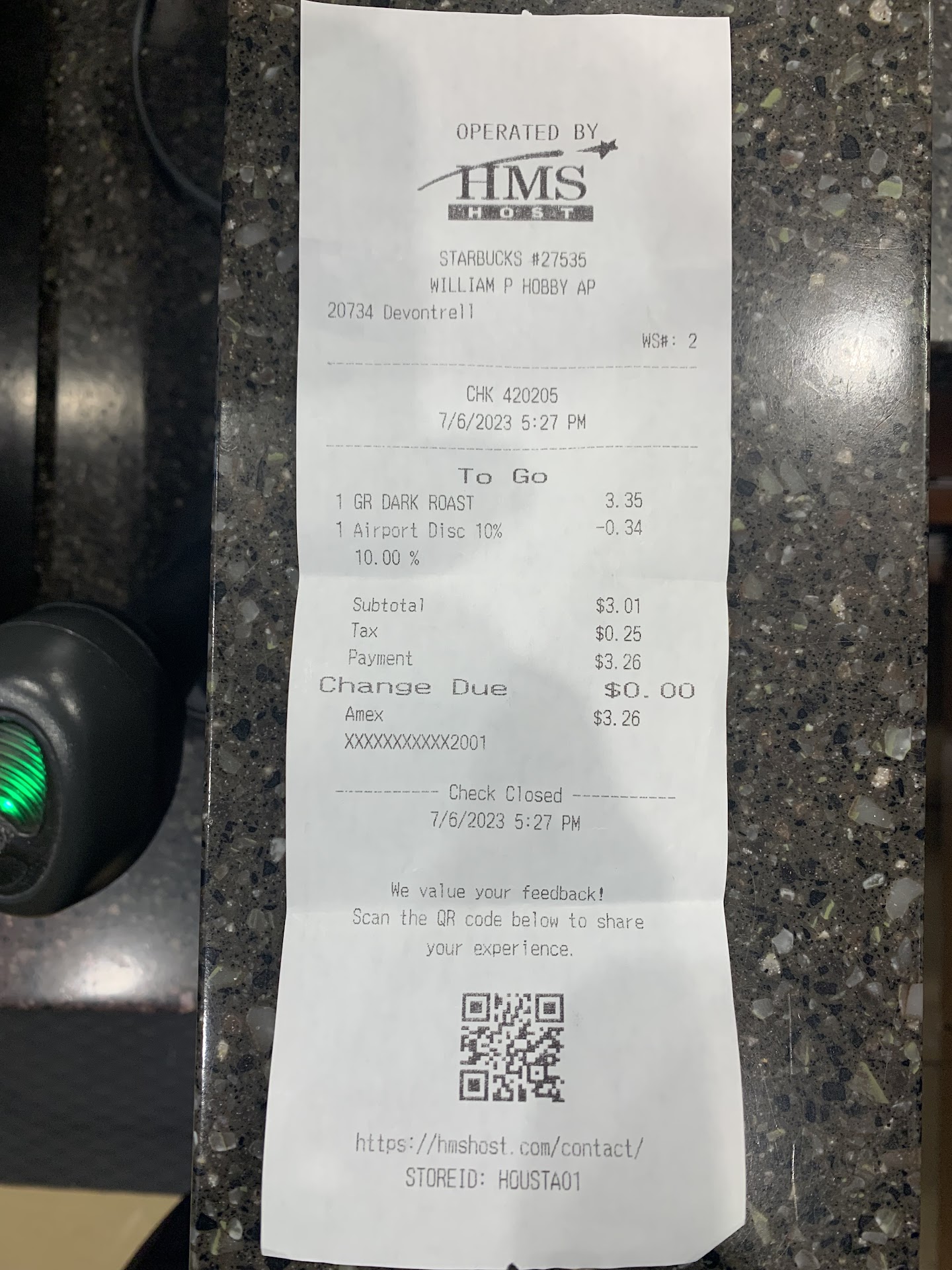 Starbucks owes me a refund my money $3.26 paid by Amex credit card ending with...