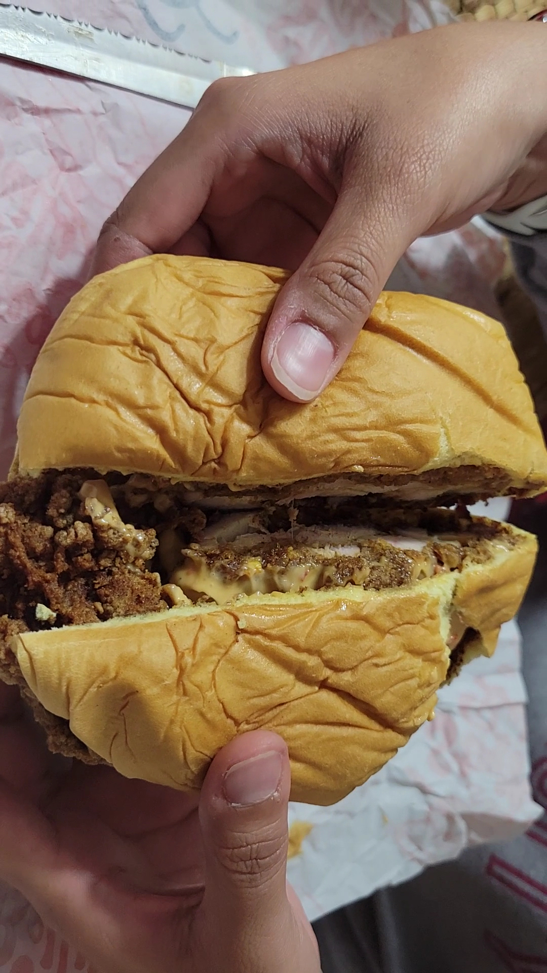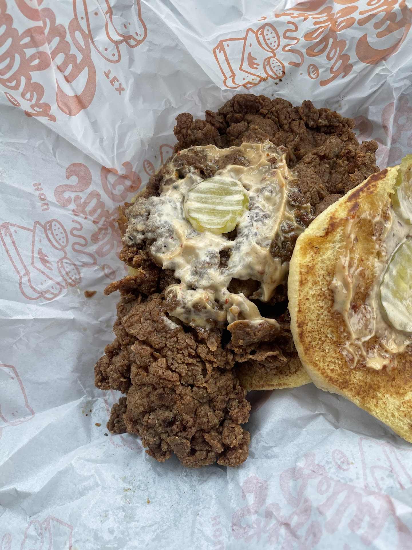 This has been on my list of places to go for a while and finally got the chance to go today. I ordered the Belly Burger with tots and my wife got the Sichuan Chicken sandwich. Counter service with friendly reception, questions were asked and answered regarding the cookie selection, all was well. Food came out pretty quick (tots had already been cooked under warmer, but were still hot and crispy). My burger was massive, probably one of the larger smash burgers I have ever had. I am guessing that they used 2 either 3.5 or 4 ounce patties. There was one piece of cheese in the middle with a scattering of grilled onions along with their smash sauce and pickles. Bun at some point hit the grill because it was light and fluffy (wife fell in love with it). The heft of the burger was impressive and overall I loved the burger. Next time I would probably request another slice of cheese on top with xtra onions. While not the best smash burger I have ever had, it is up there with them while supplying a pretty heafty burger for the $$. Tots were tots, they were good and crispy with good potato flavor. As for the chicken, my wife was wanting a more spicy experience, but some of that is on her because she got the sauce on the side. I had several bites that I dipped in the sauce and found the sandwich to be really good (will probably get this the next time we go). I see someone here pointed out the color of the chicken made it look like it was fried in old oil, ignore that, there is seasoning in the batter that gives it the darkish red color, if it was fried in old oil, you would know that when you took your first bite. The chicken with the sauce has good flavor, it is light on the mala so don't go into it thinking your going to get your tongue numbed (which I would have liked). Overall, will be going back here soon because I didn't even get the egg salad, which I am a sucker for. Upon leaving we ended up passing on the cookie and getting the Cinnabelly dunkers. Man, worth driving there for these alone. It seems to be a think bread pudding made from their left over bread, with a health dose of apple pie spices and it comes served with 4 pieces (totalling the size of a piece of bread) along with a vanilla icing for dipping. ...