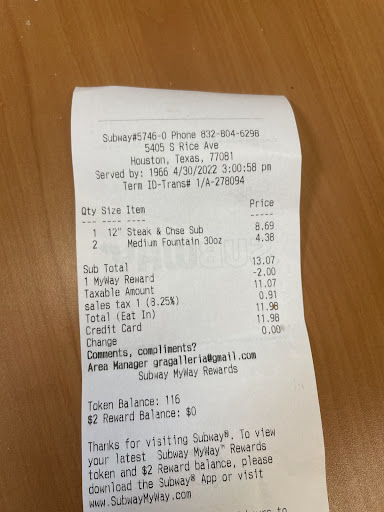 Second: I had $2 to redeem and the woman thy I believe is one of the owners told me I can’t use my rewards … I said “WHY “ if it’s a subway … she told me I can’t ! That I can only collect !