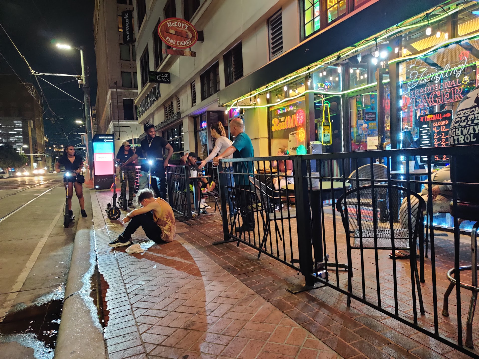 Nobody came by to offer me a menu nor inquired why I was sitting in their outdoor chair. A coloured woman and two coloured men (professional types) bought some ice cream from a truck while enjoying drinks and each others company. Other people seemed to act silly, such as blowing smoke their way, strongly and on purpose among other things. Then repeatedly a skinny, ageing white woman kept going in and out of the bar to the next door housing type building with and without man/men. Since it was my first night in Houston, it was very late and I was trying to avoid some aggressive, crazy type men a few blocks away, I just sat petrified. Later, many men in expensive vehicles with loud music blasting out made loud comments about wanting to pick people up for all kinds of things. This happens everywhere in the world. I guess society and law enforcement allows this sort of stuff in certain areas and times. Maybe no REAL crimes were...