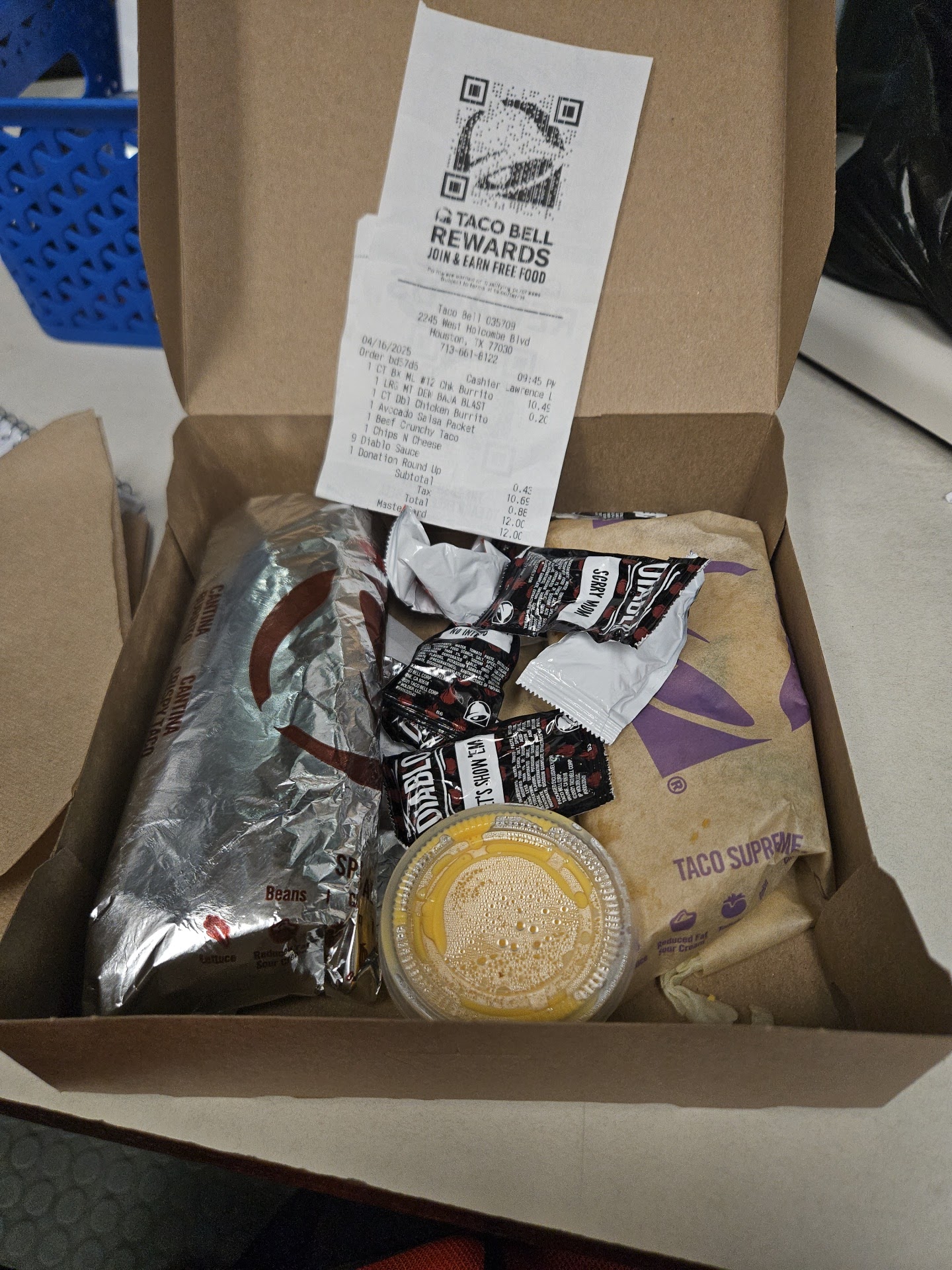 I order a 3 taco meal with a water cup. I'm handed a water bottle. I say "oh, I wanted a cup of water, not to be charged for a bottle". Drive thru says it would have been the same price, so I take the bottle with me, park and glance at the receipt.