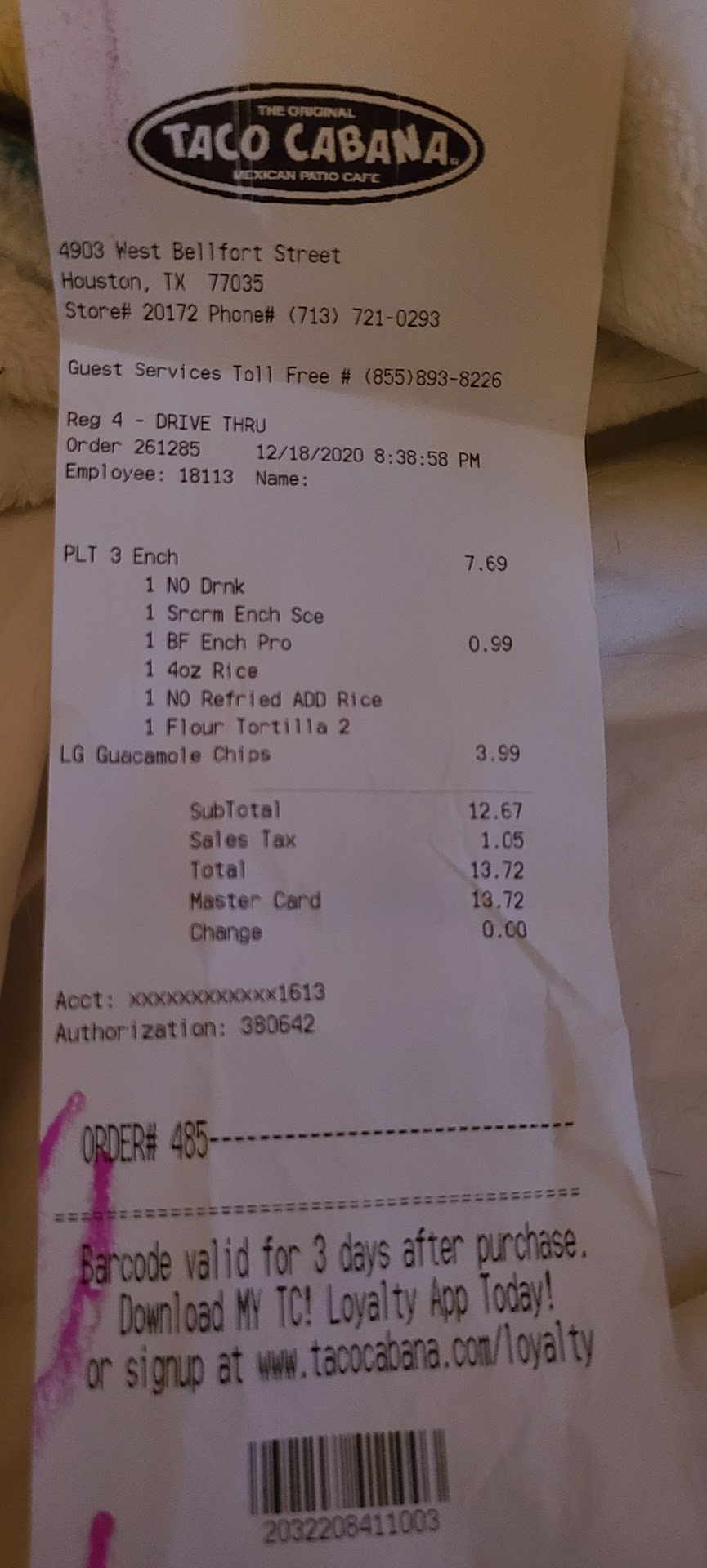 So I used to like the food at Taco Cabana. Flamente chicken was the BEST, then I moved to the cabana bowl... One gone the other now sucks... No need to return...
