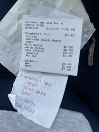 I went inside the restaurant to order Jasmine Did not greet me at all she simply just waited at her register until I walked up to the register to order my breakfast taco..